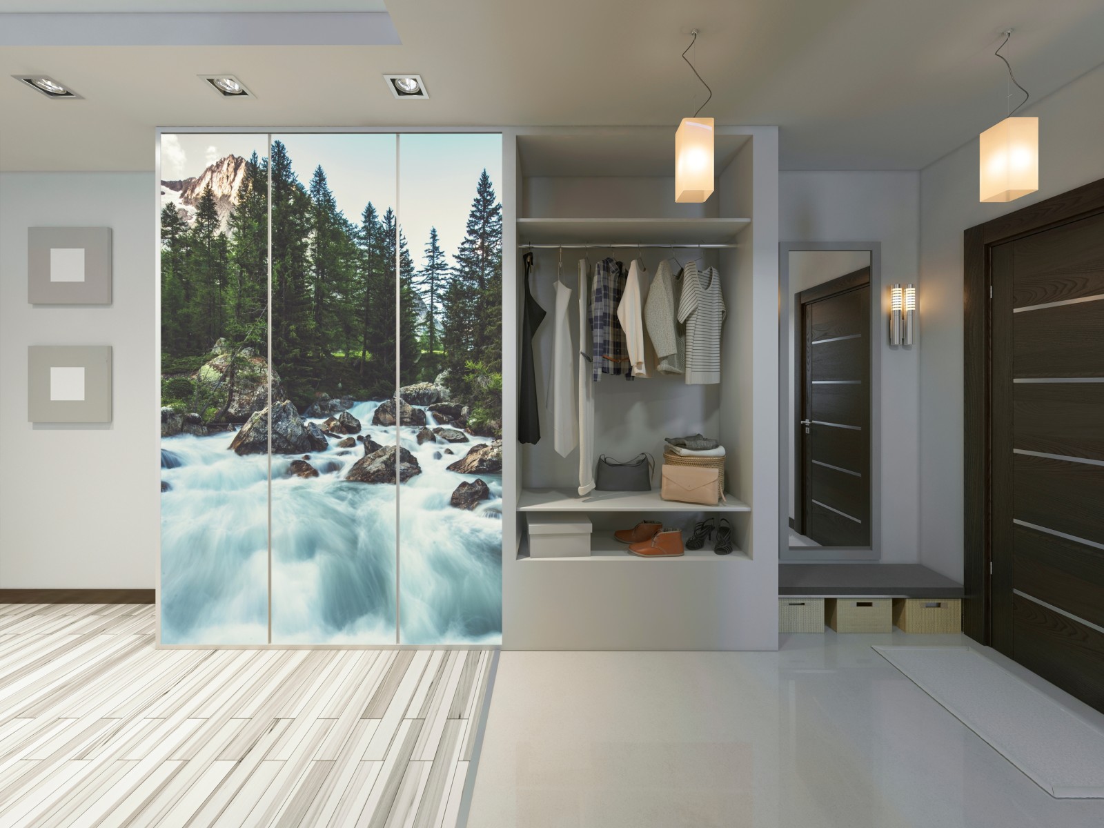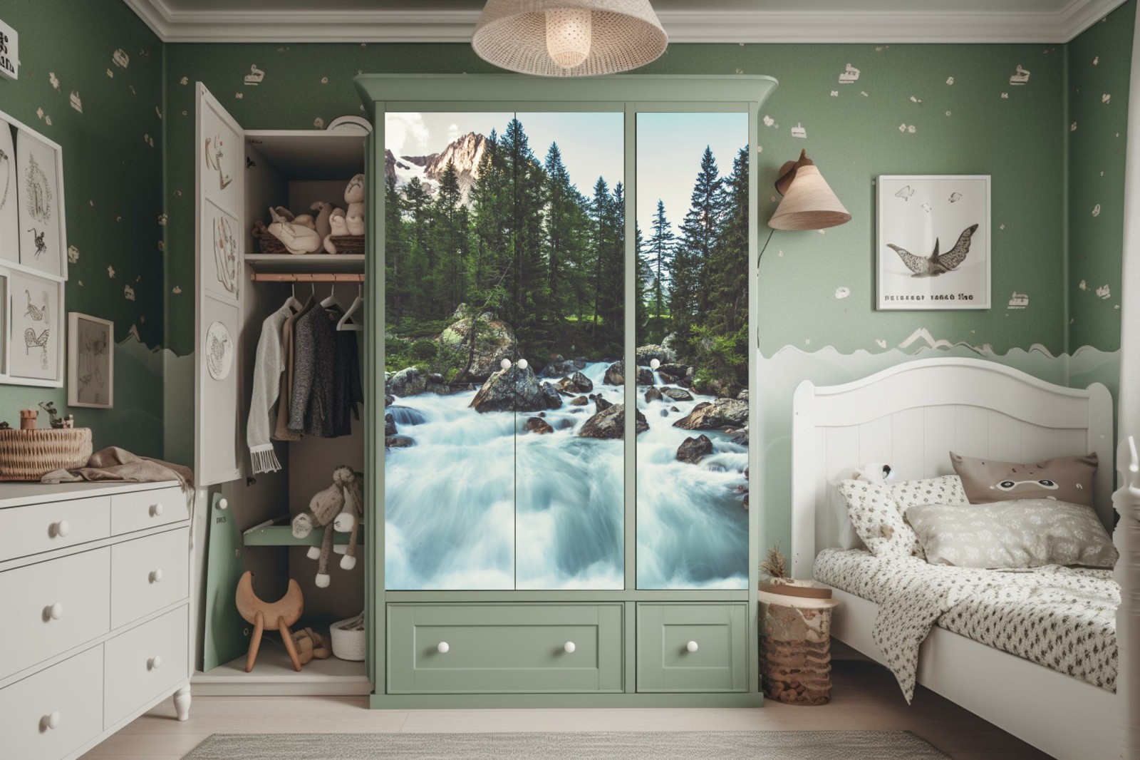 Bringen Sie die ruhige Energie eines Gebirgsflusses in Ihren Raum mit diesem lebendigen Alpenpanorama mit rauschendem Wasser, schroffen Gipfeln und dichtem Wald.