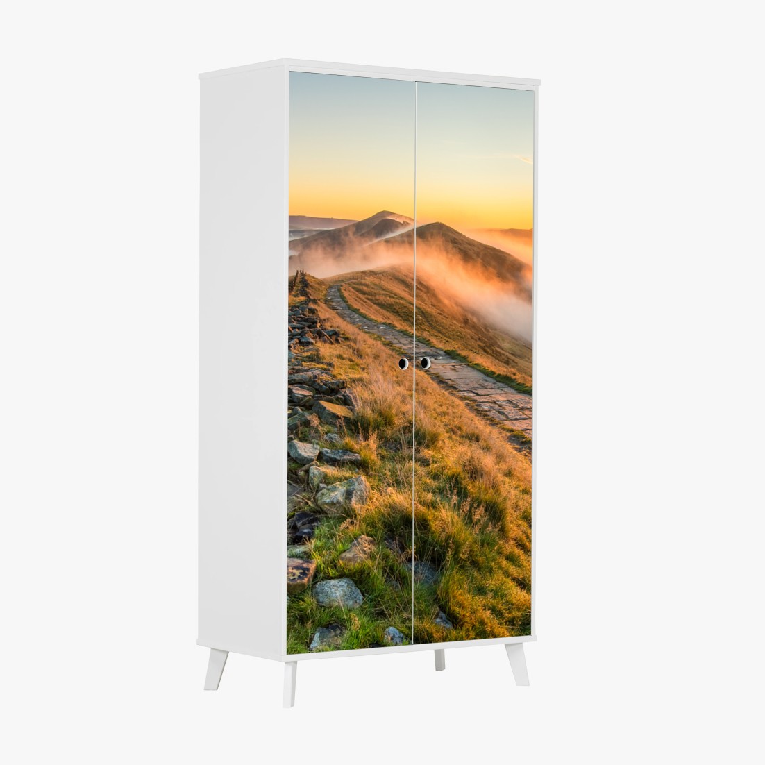 Schrankaufkleber Sonnenaufgang über einem nebligen bergrücken mit steinweg