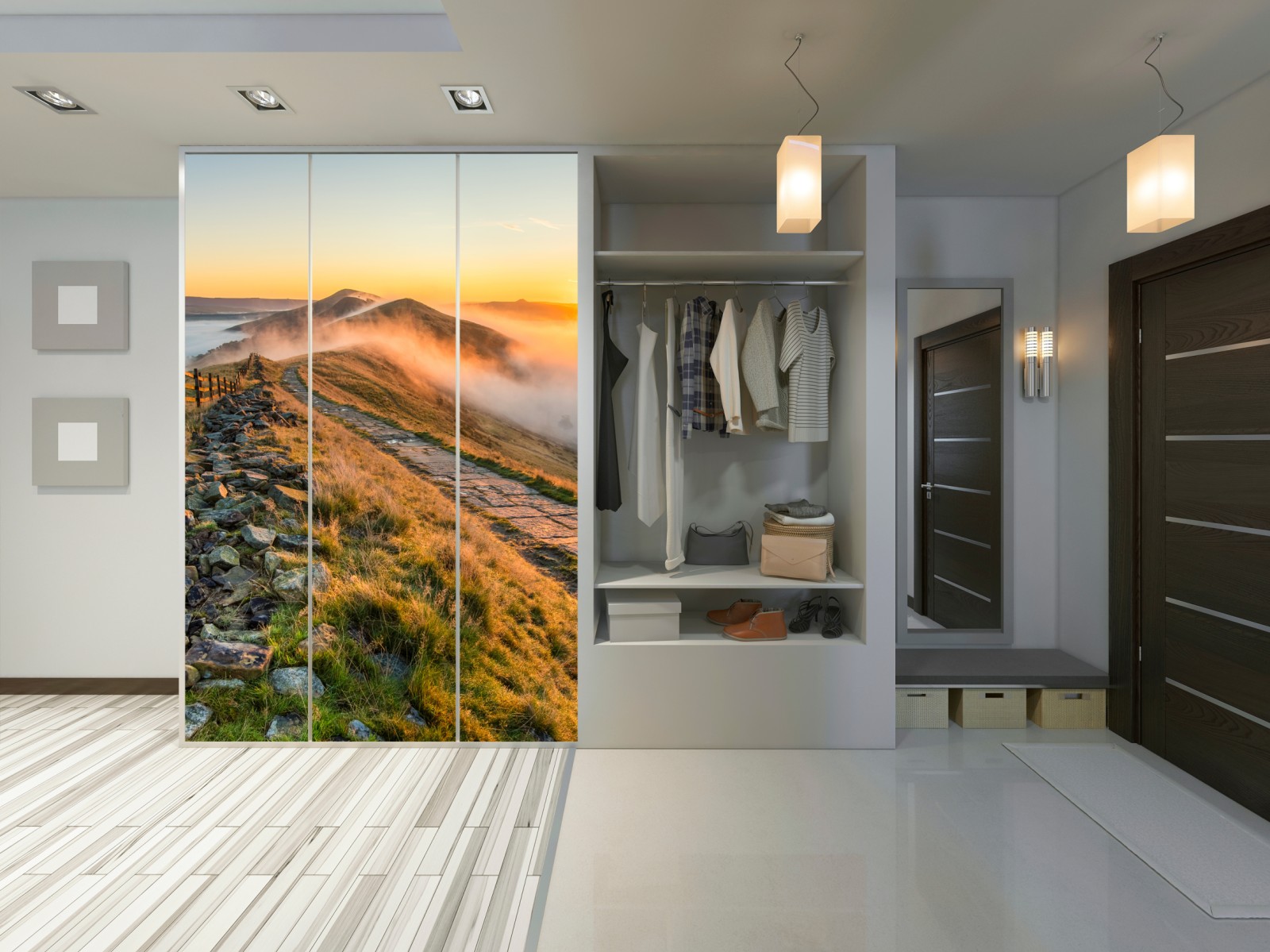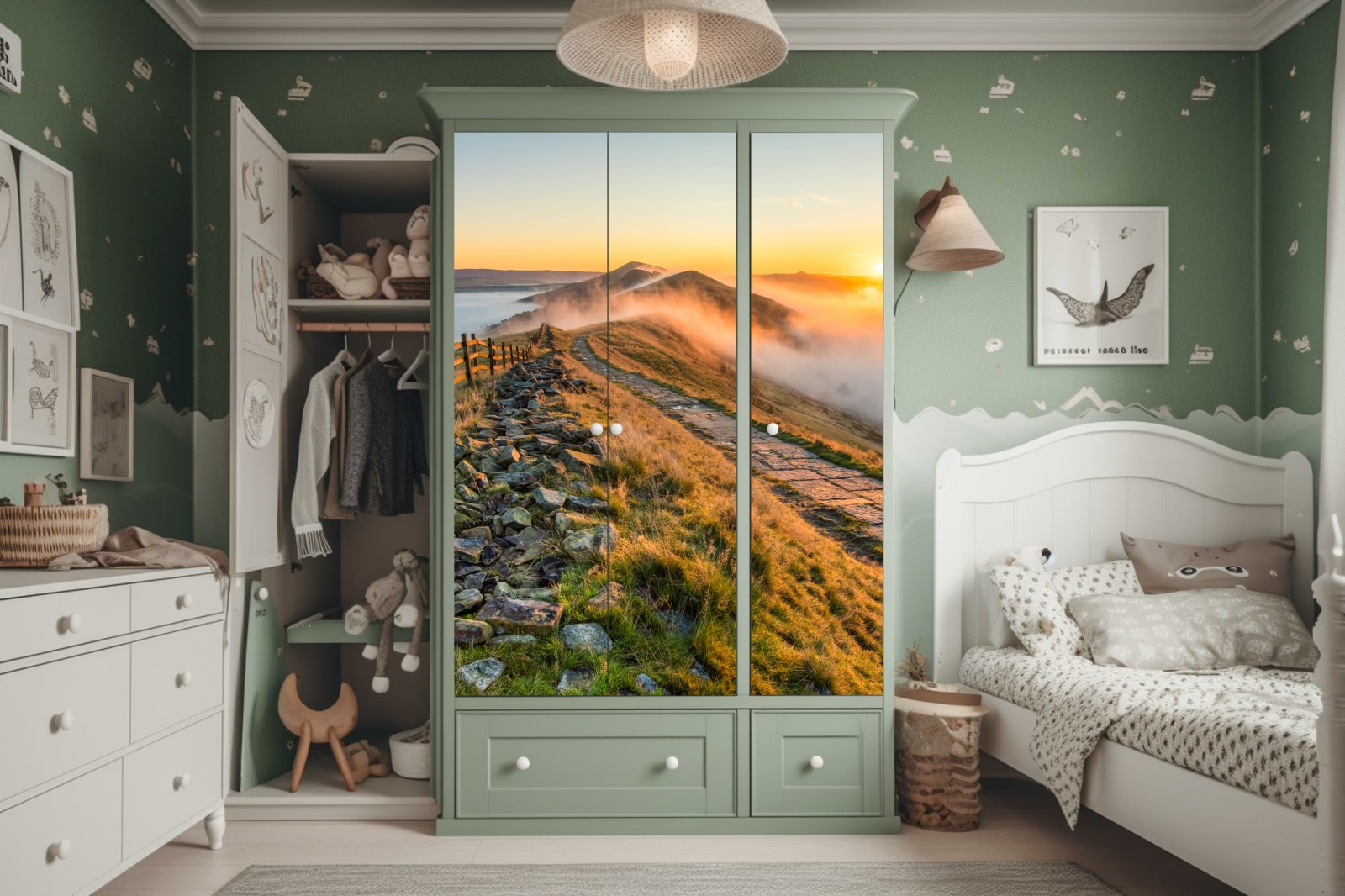Schrankaufkleber sonnenaufgang über einem nebligen bergrücken mit steinweg