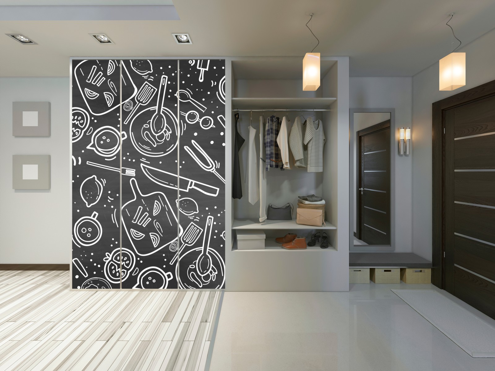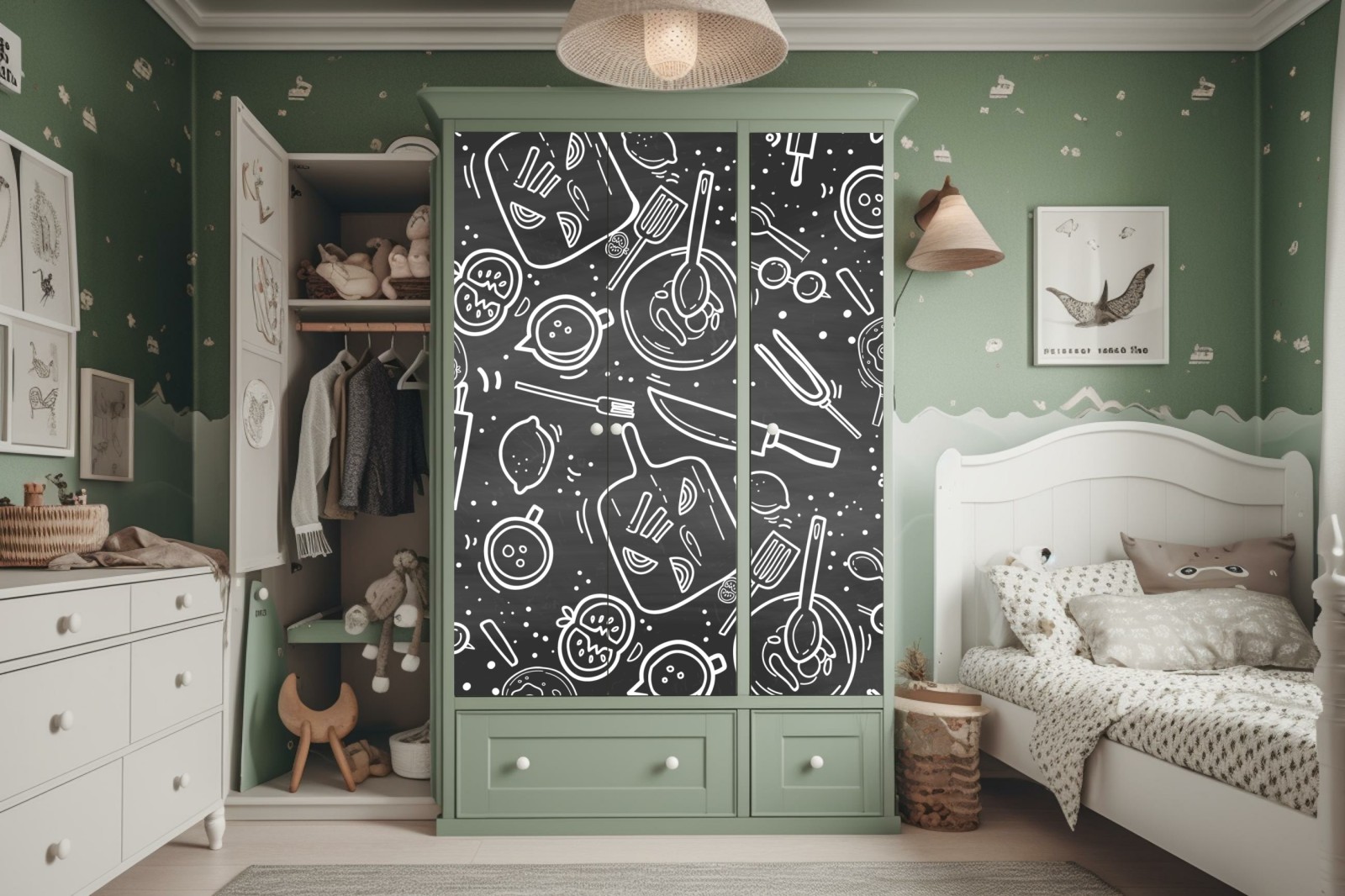 Bringen Sie mit diesem monochromen Tafel-Doodle-Muster verspielte Kochatmosphäre in Ihre Küche, perfekt für moderne und minimalistische Räume.