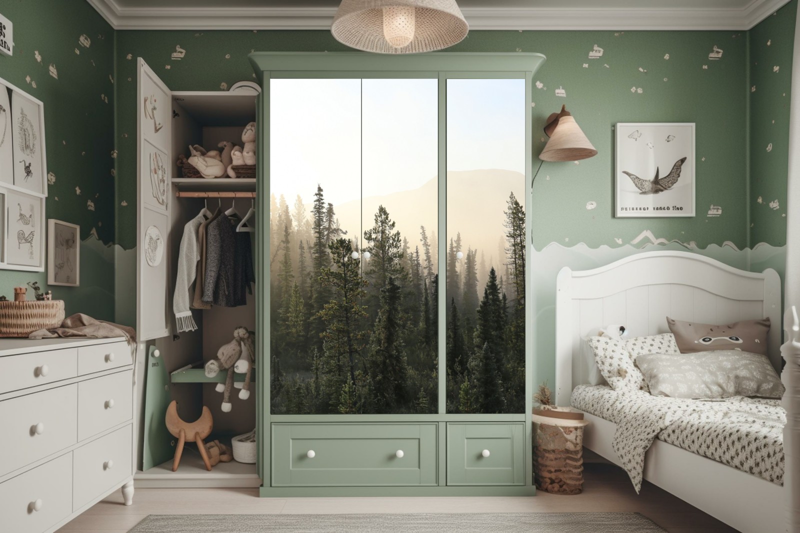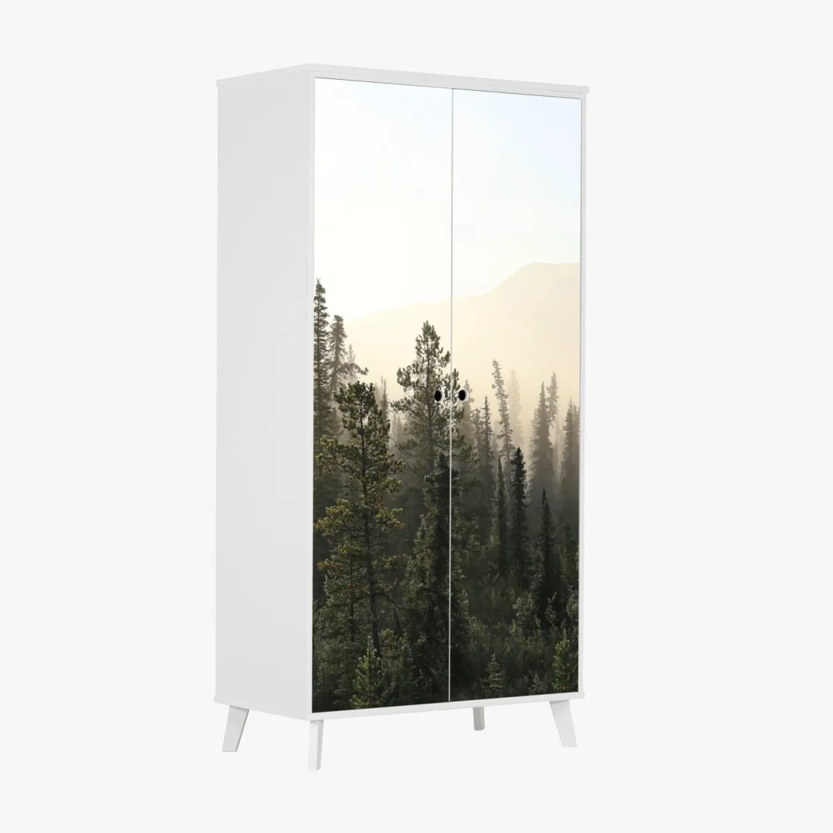 Schrankaufkleber nebliger kiefernwald bei sonnenaufgang