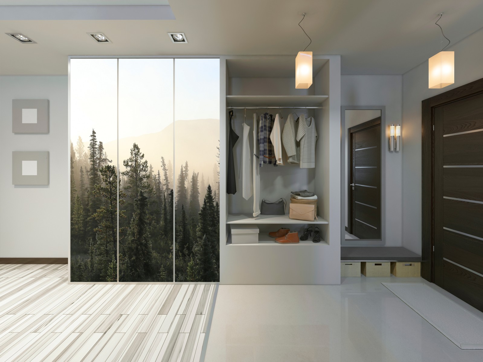 Ein ruhiger nebliger Kiefernwald bei Sonnenaufgang bringt eine beruhigende, natürliche Atmosphäre und Tiefe in jeden Raum.