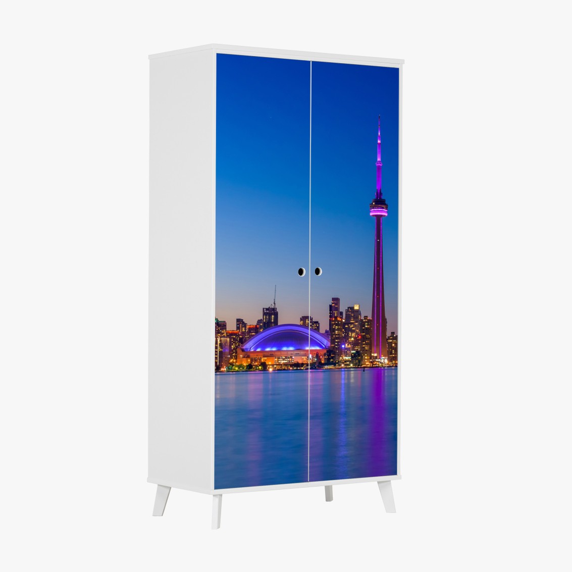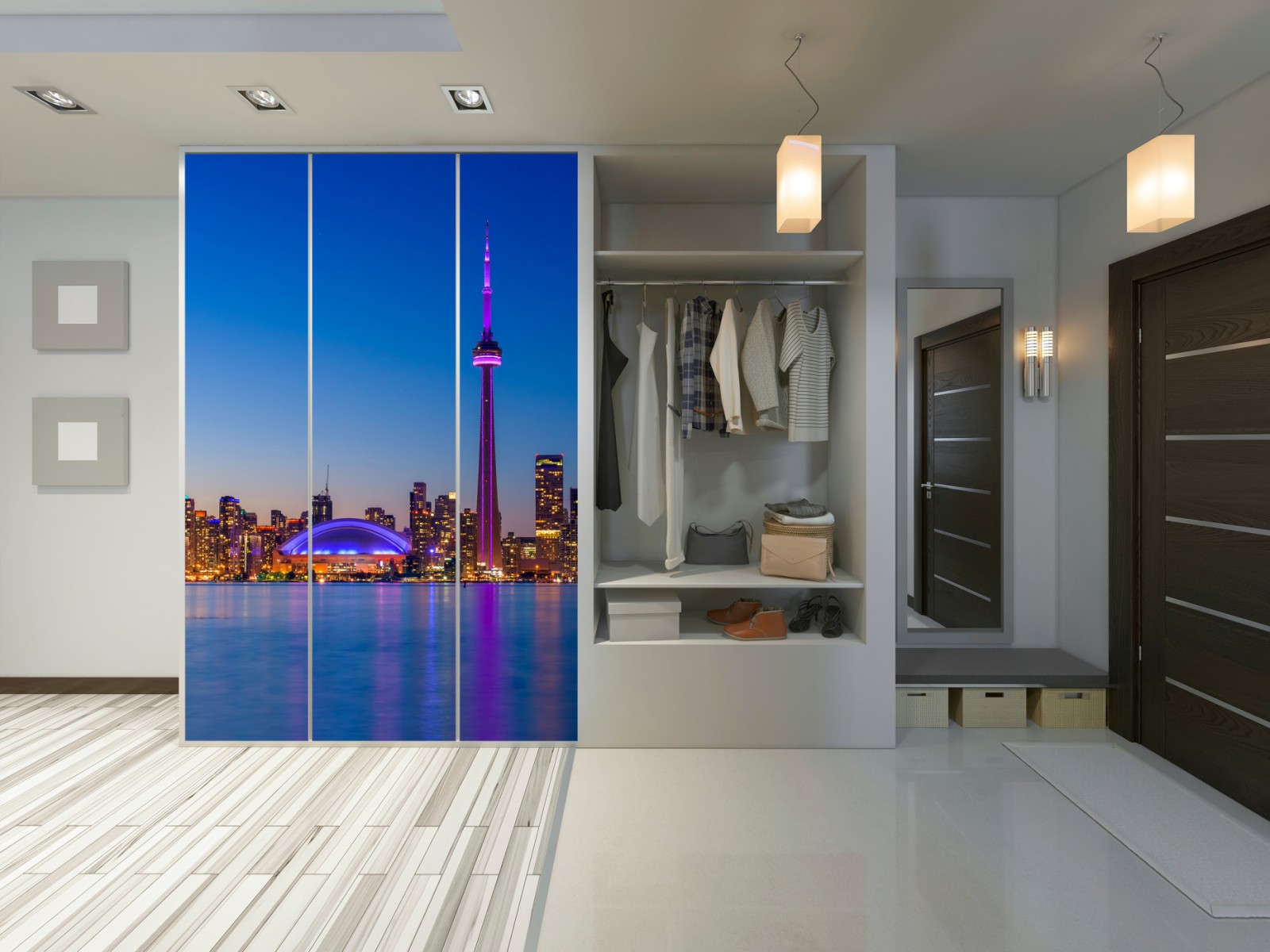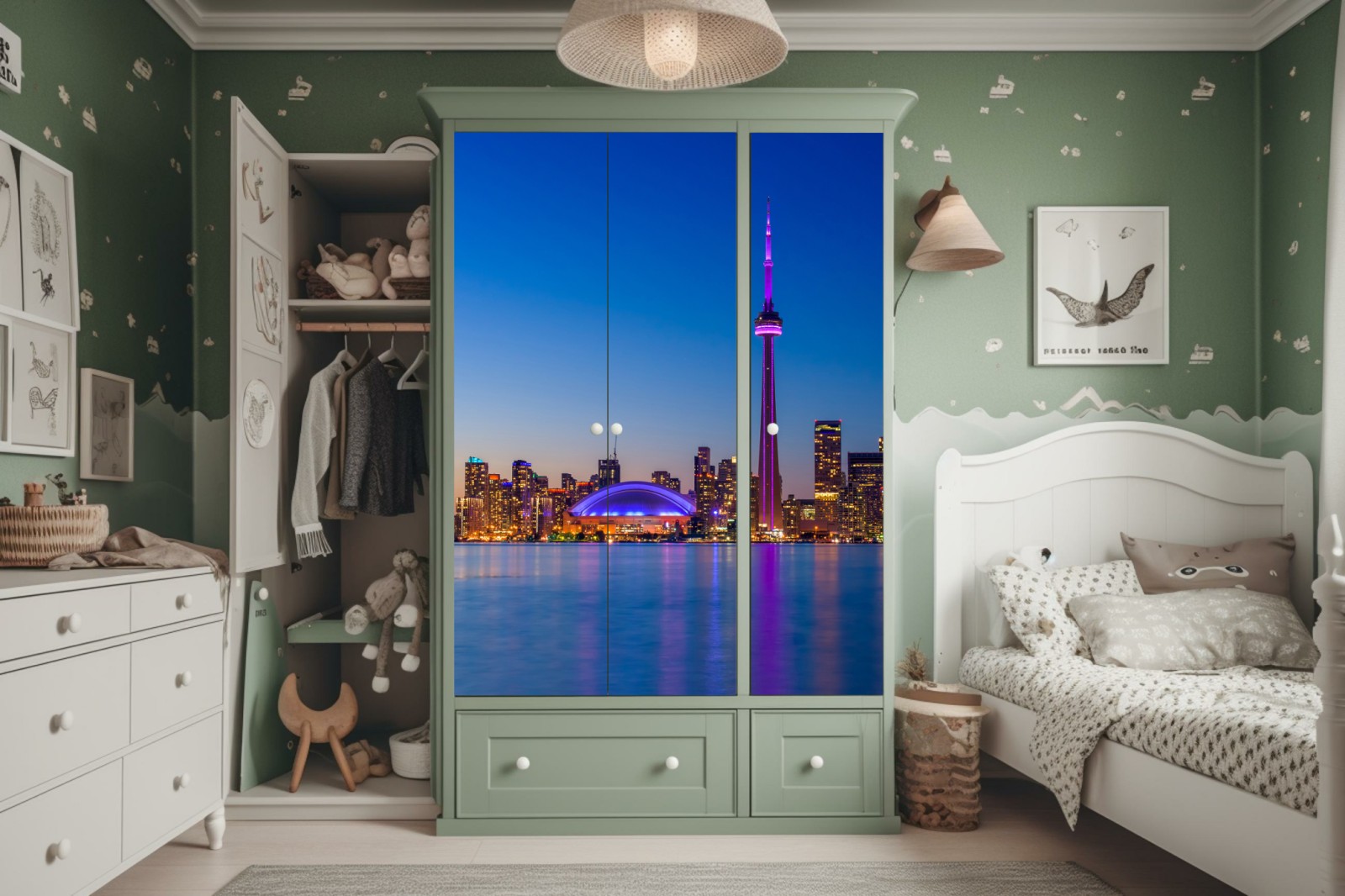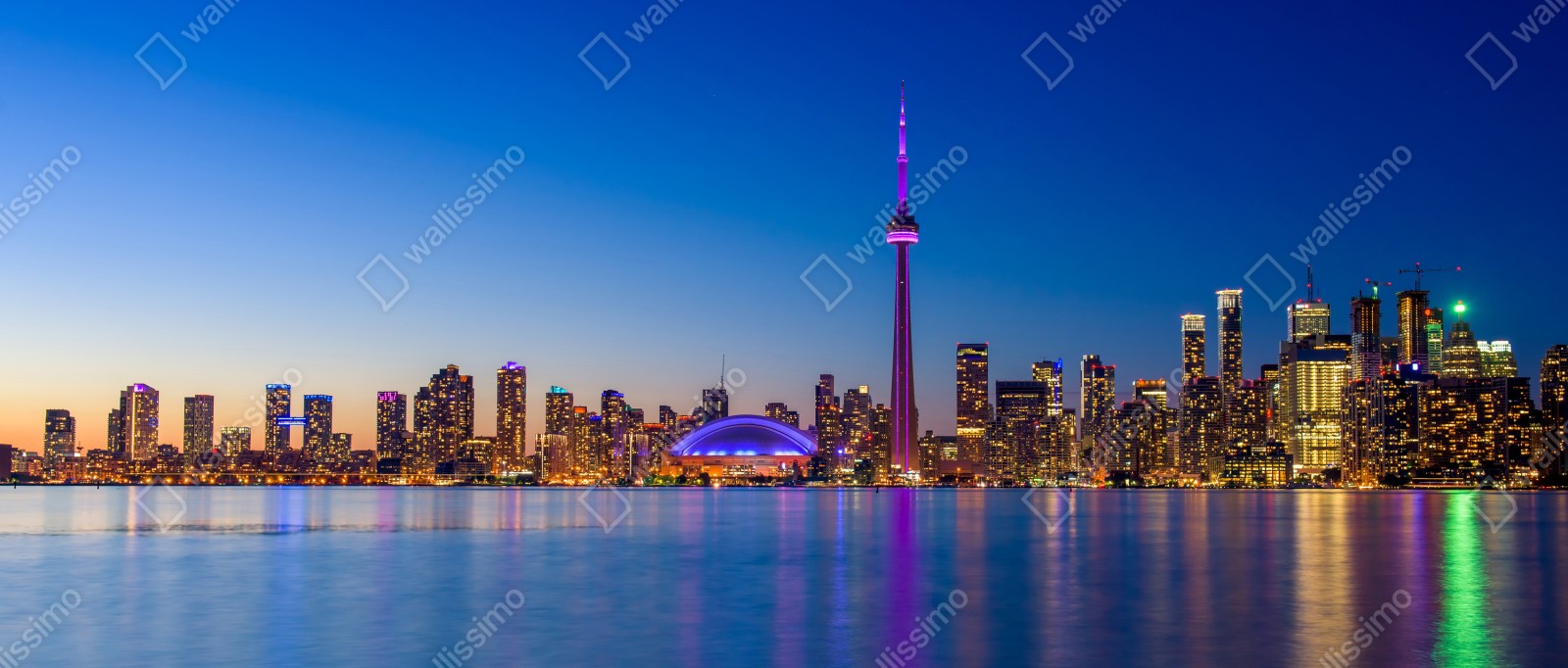 Atemberaubende panoramaansicht der beleuchteten skyline von Toronto bei dämmerung mit reflexionen im ruhigen wasser, ideal für moderne innenräume und urbane dekoration.