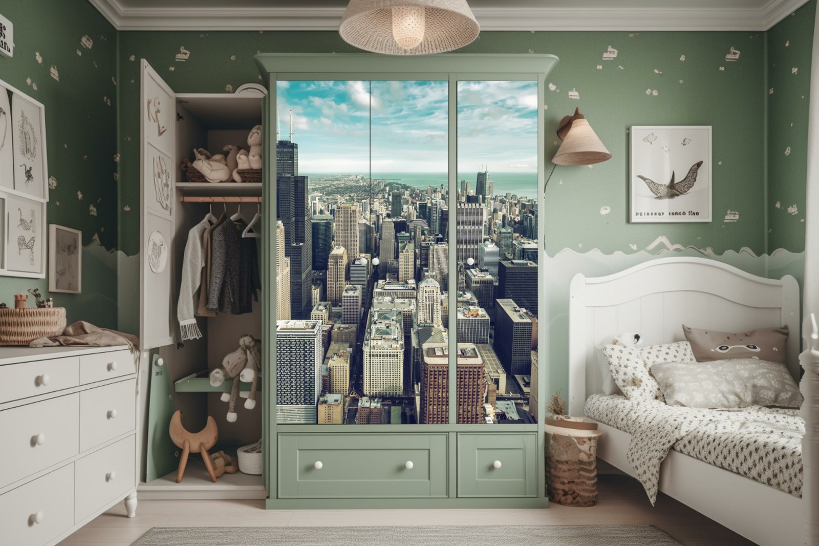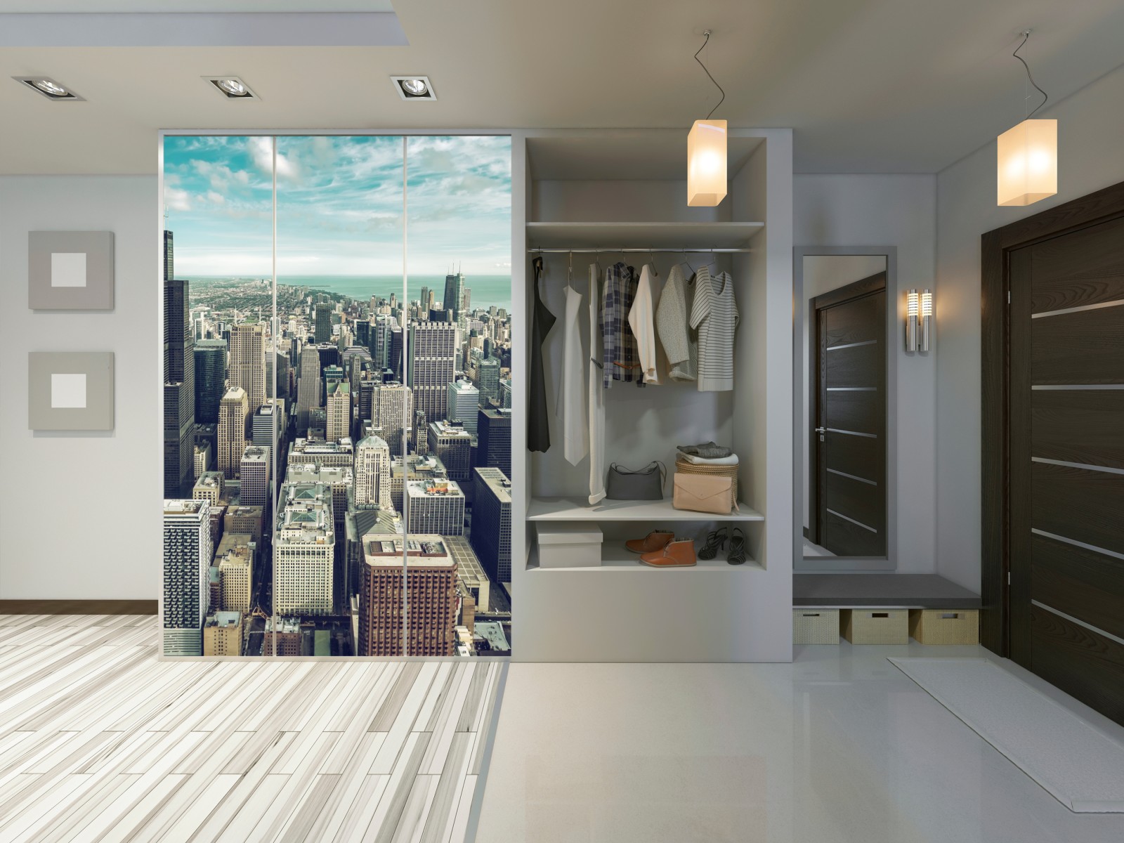 Beeindruckende Luftaufnahme der Chicagoer Skyline in türkis-vintagetönen, perfekt, um modernen Räumen urbanen Charakter zu verleihen.