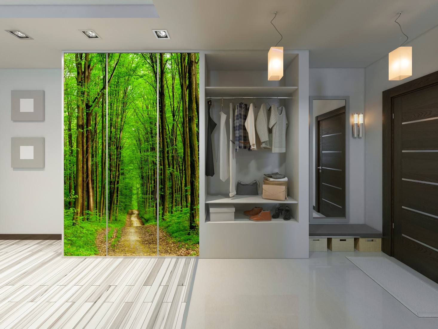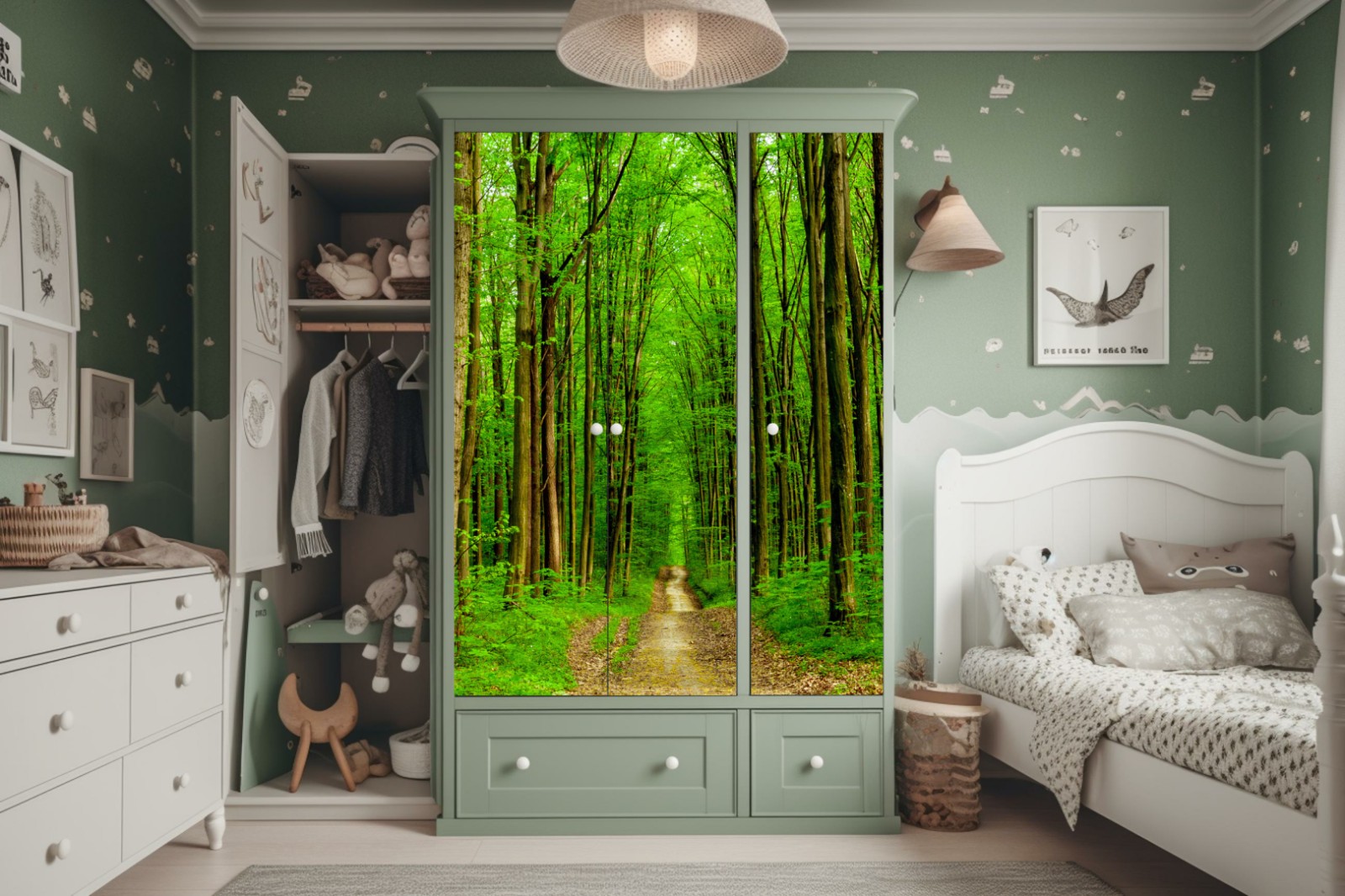 üppiger grüner waldweg im frühling, perfekt um die ruhe der natur in ihren raum zu bringen.