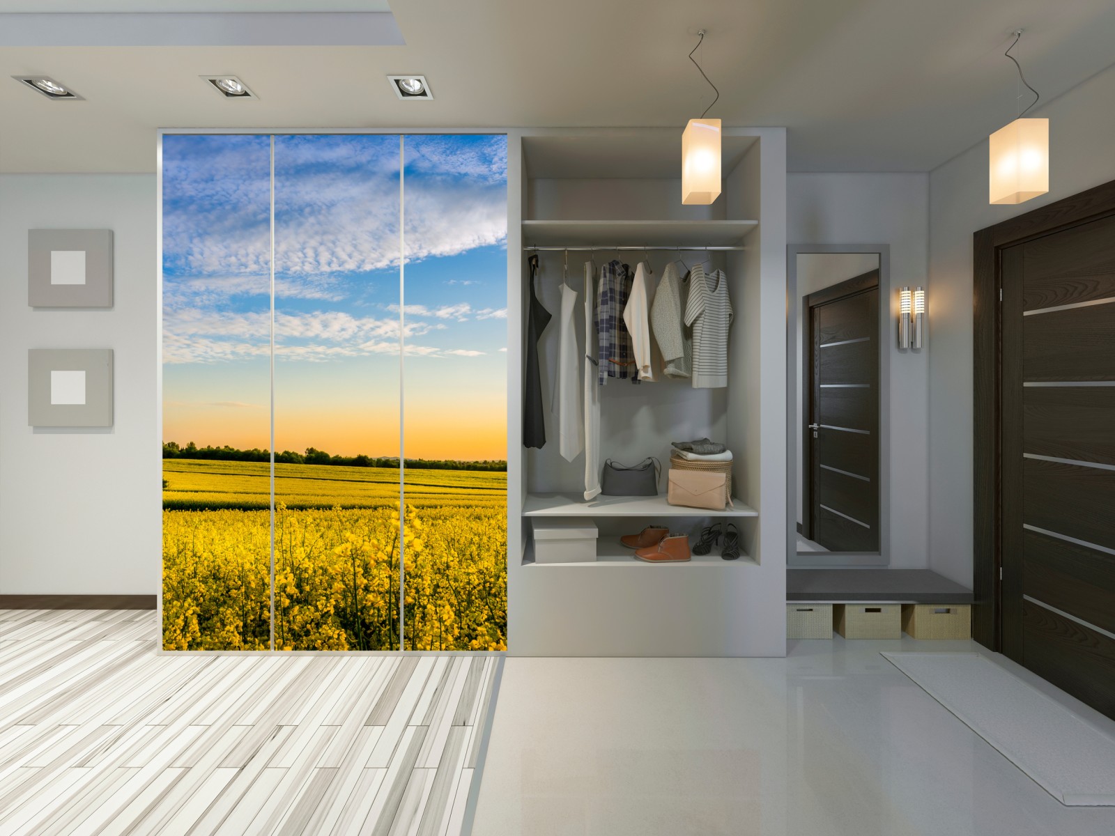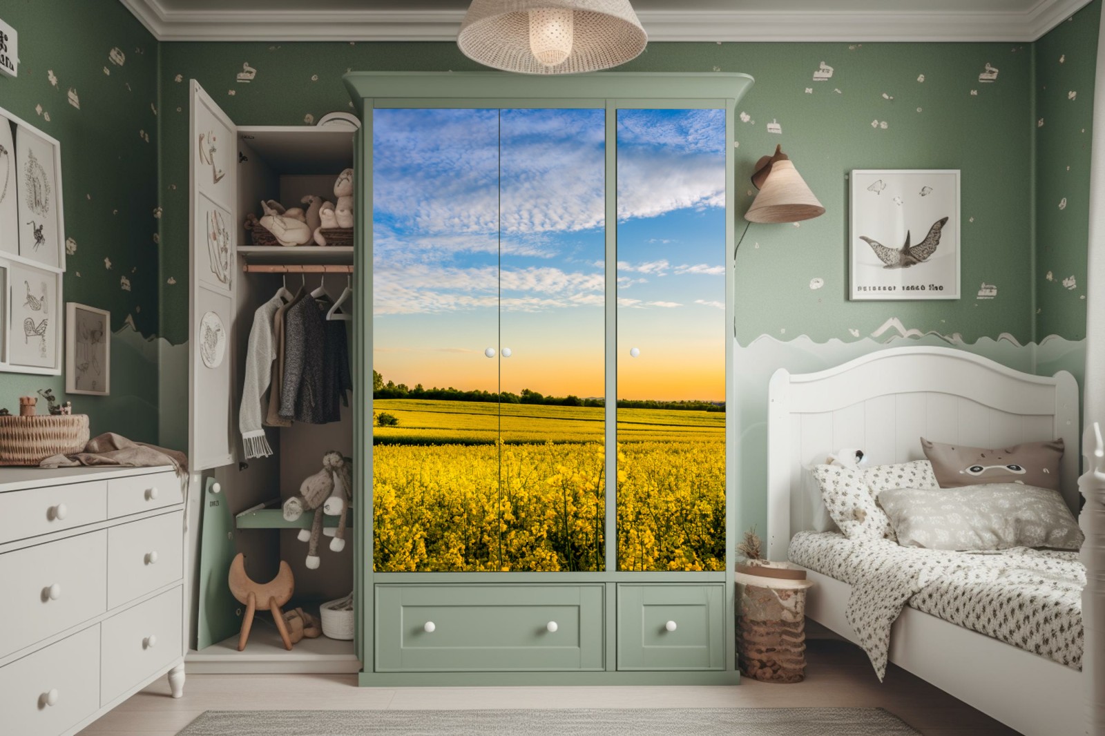 Schrankaufkleber sonnenbeschienenes rapsfeld im abendlicht