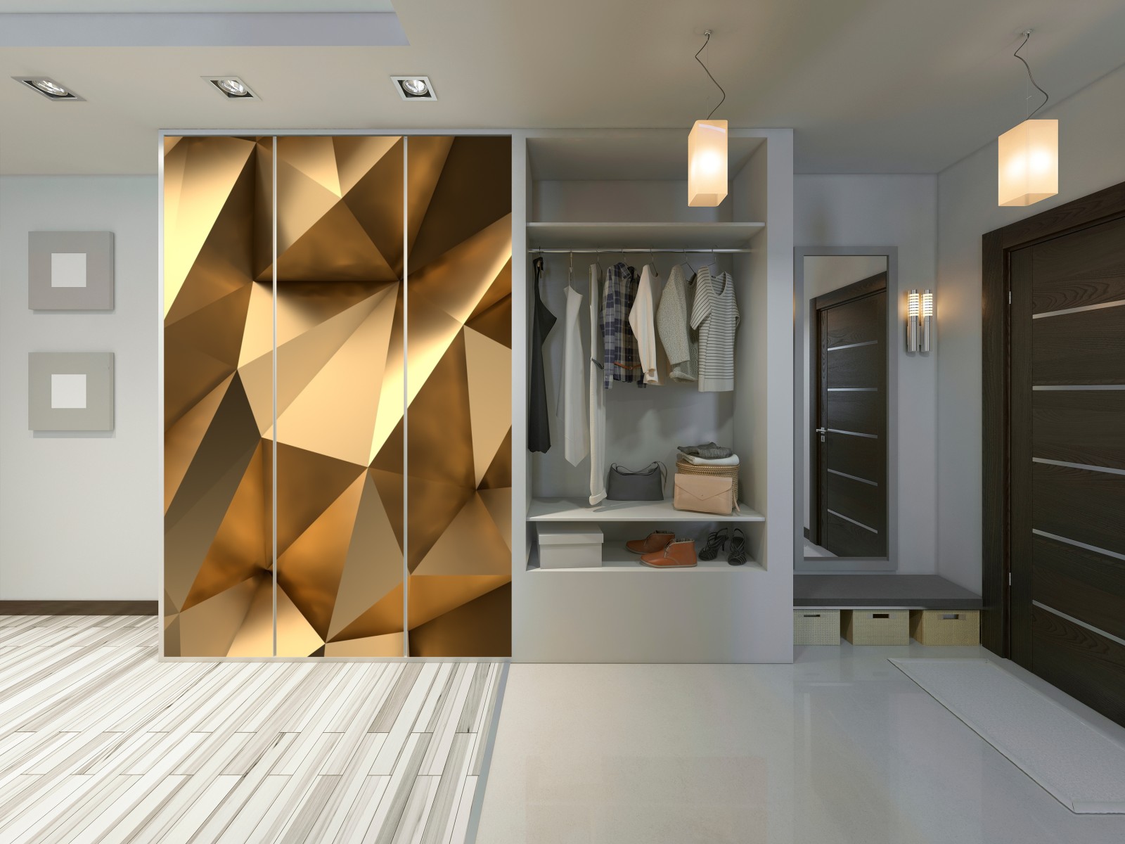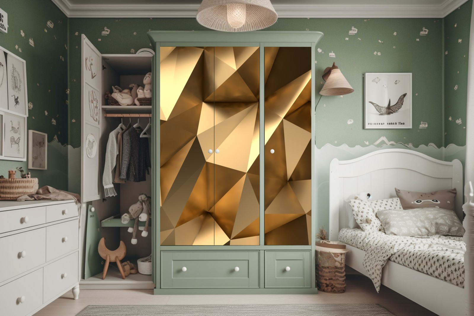 Luxuriöse goldene geometrische Komposition mit facettenförmigen 3D-Elementen verleiht jedem Interieur moderne Eleganz und Tiefe.