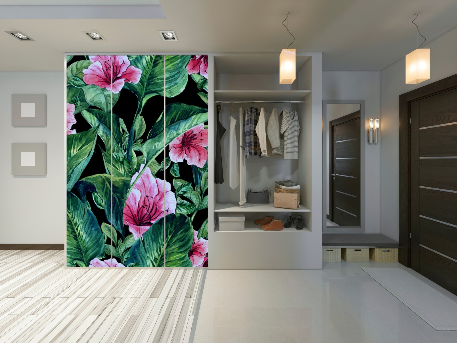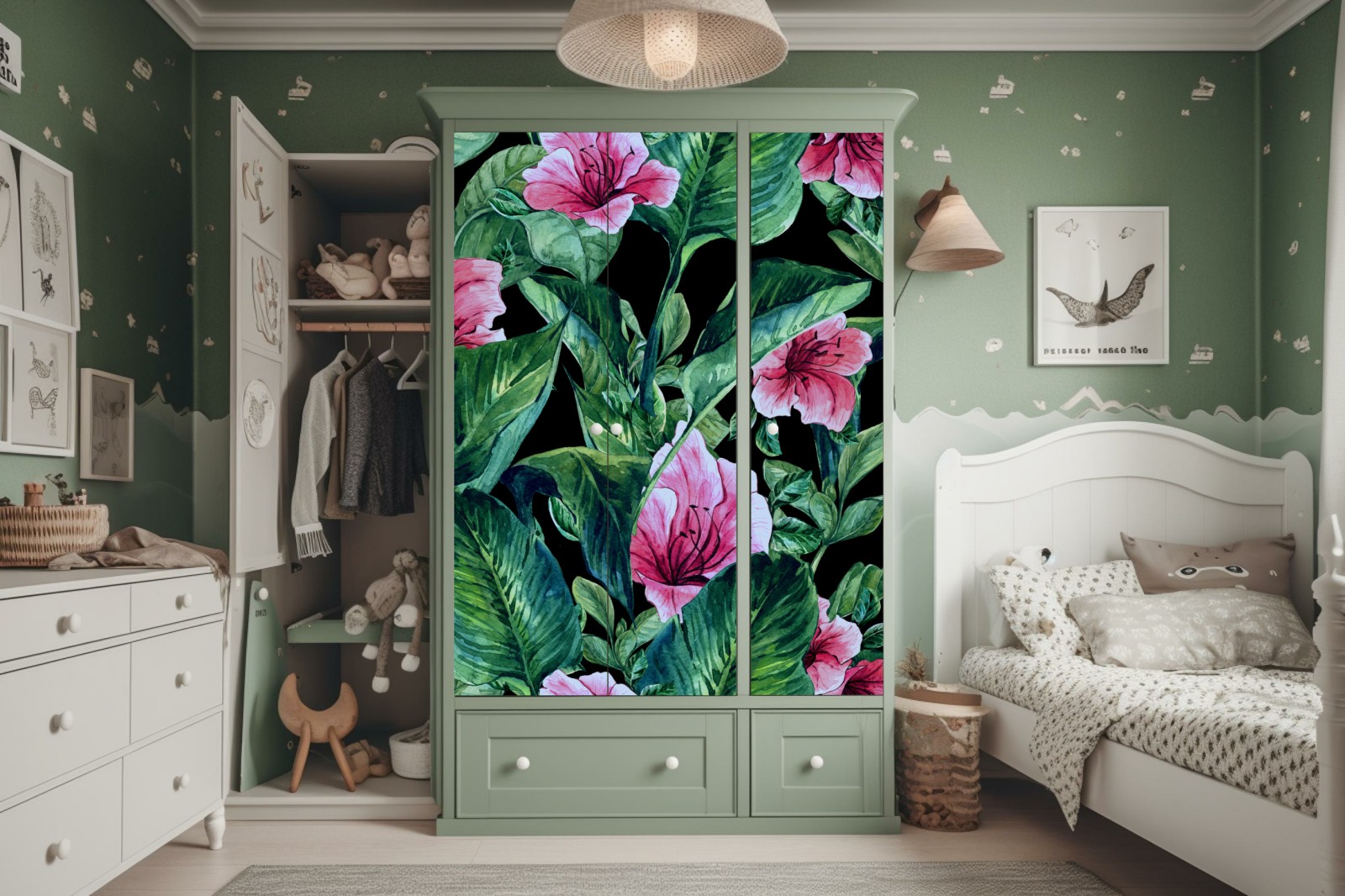 leuchtende rosa aquarellblumen und üppige grüne blätter schaffen ein kräftiges botanisches design auf tiefschwarzem hintergrund und verleihen jedem interieur natürliche eleganz und dramatischen kontrast.