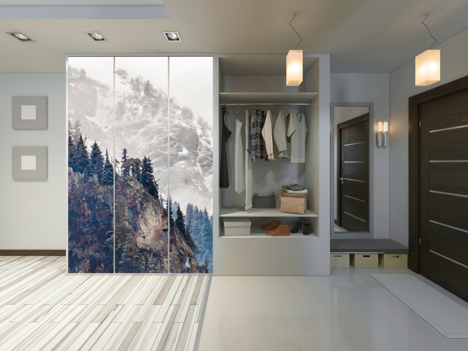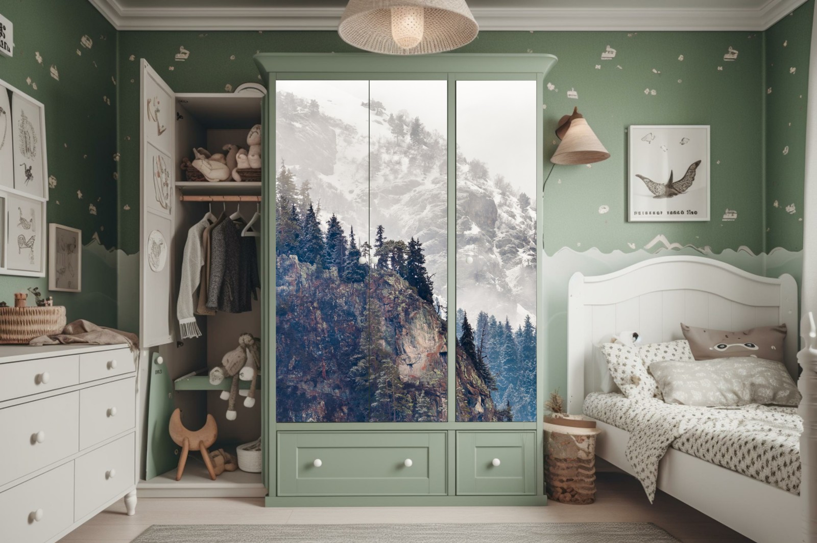 Schrankaufkleber nebliger berg mit felsklippe und kieferwald