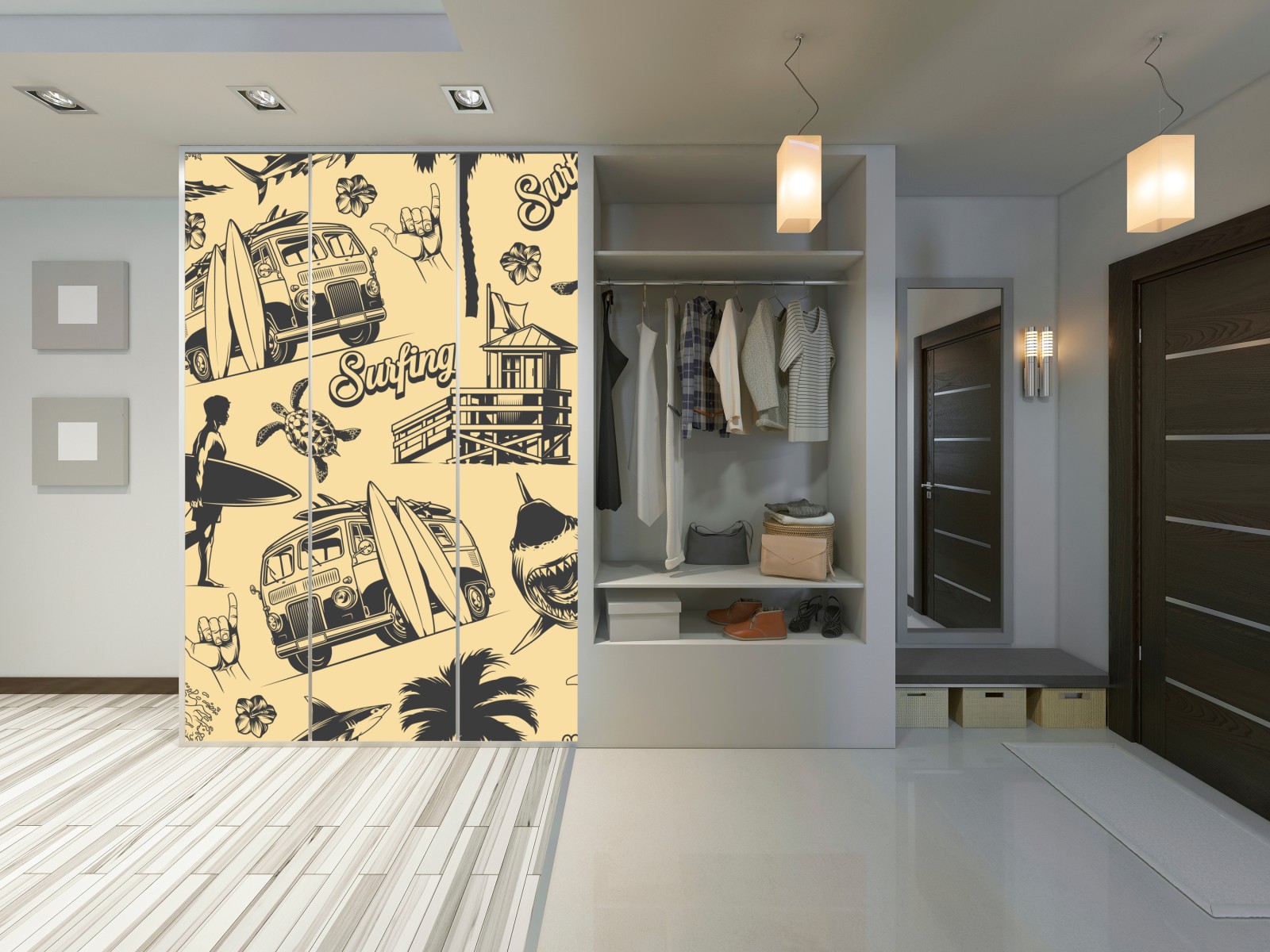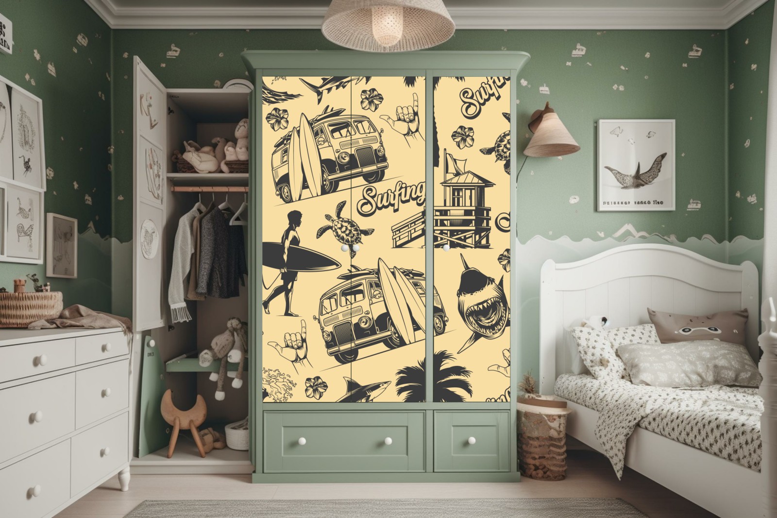Schrankaufkleber retro surfing muster mit campingbus und wellen