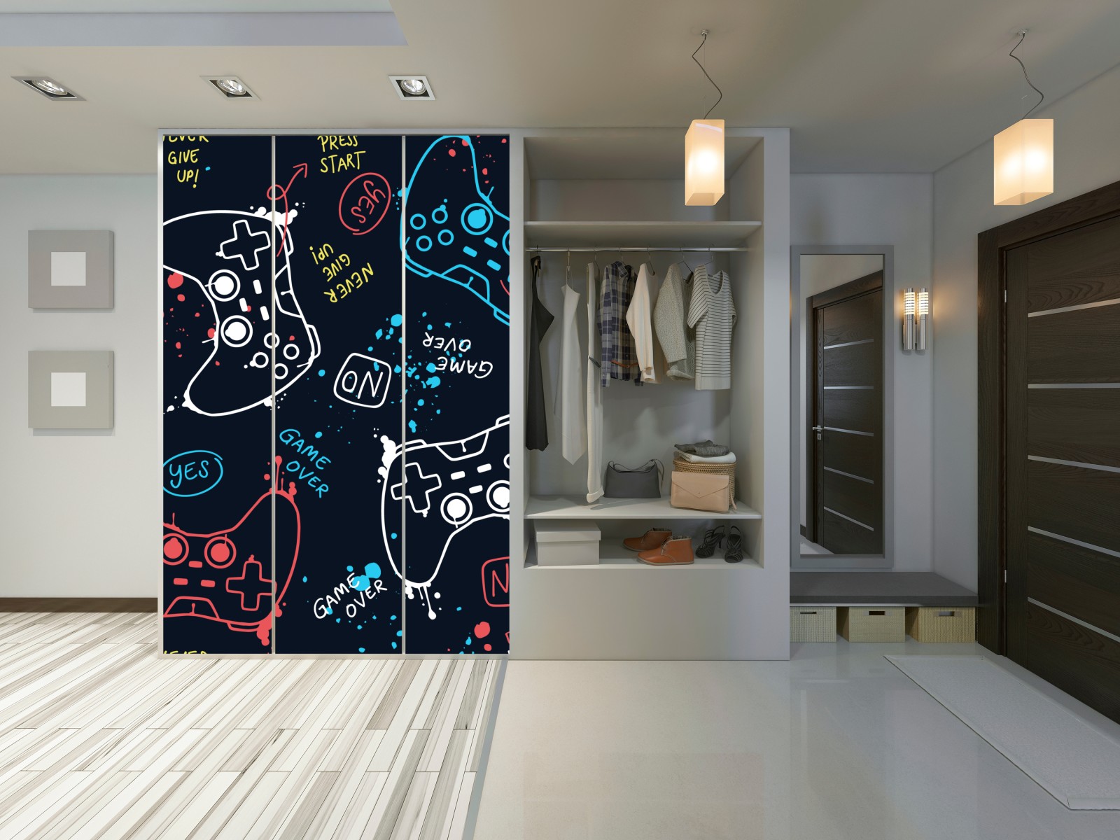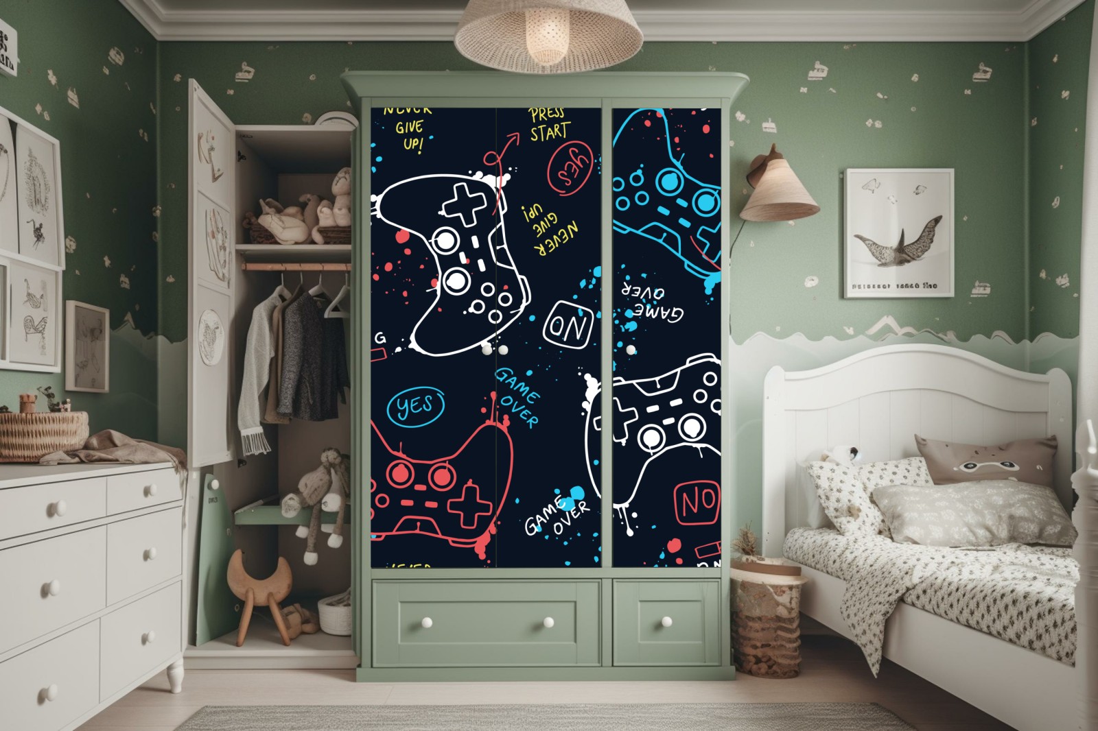 kräftiges und verspieltes gamepad-muster mit neonfarbenen akzenten und dynamischen spritzern belebt kinderzimmer oder gaming-bereich.