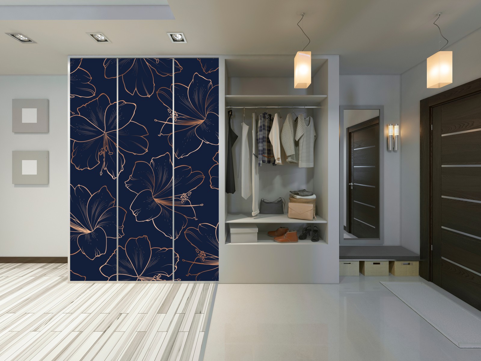 Elegantes dunkelblaues Design mit feinen goldenen Blumenlinien verleiht modernen Innenräumen einen luxuriösen botanischen Akzent.