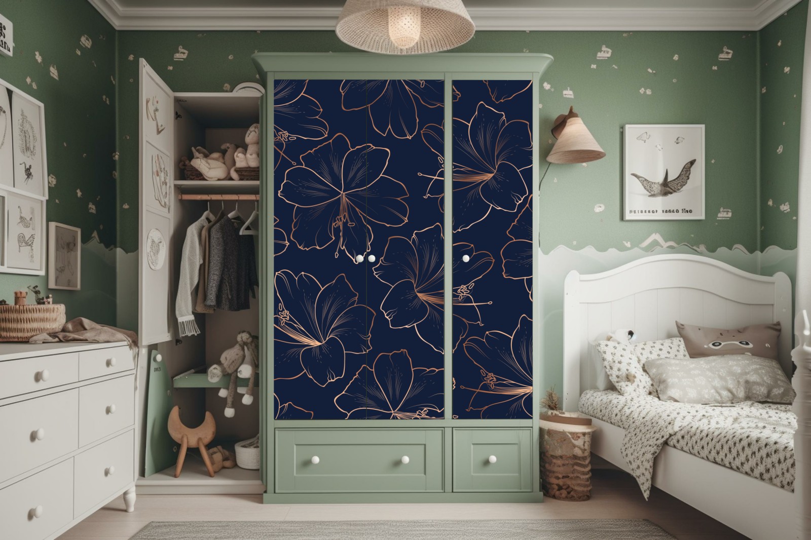 Schrankaufkleber dunkelblaues muster mit goldenen blumenkonturen