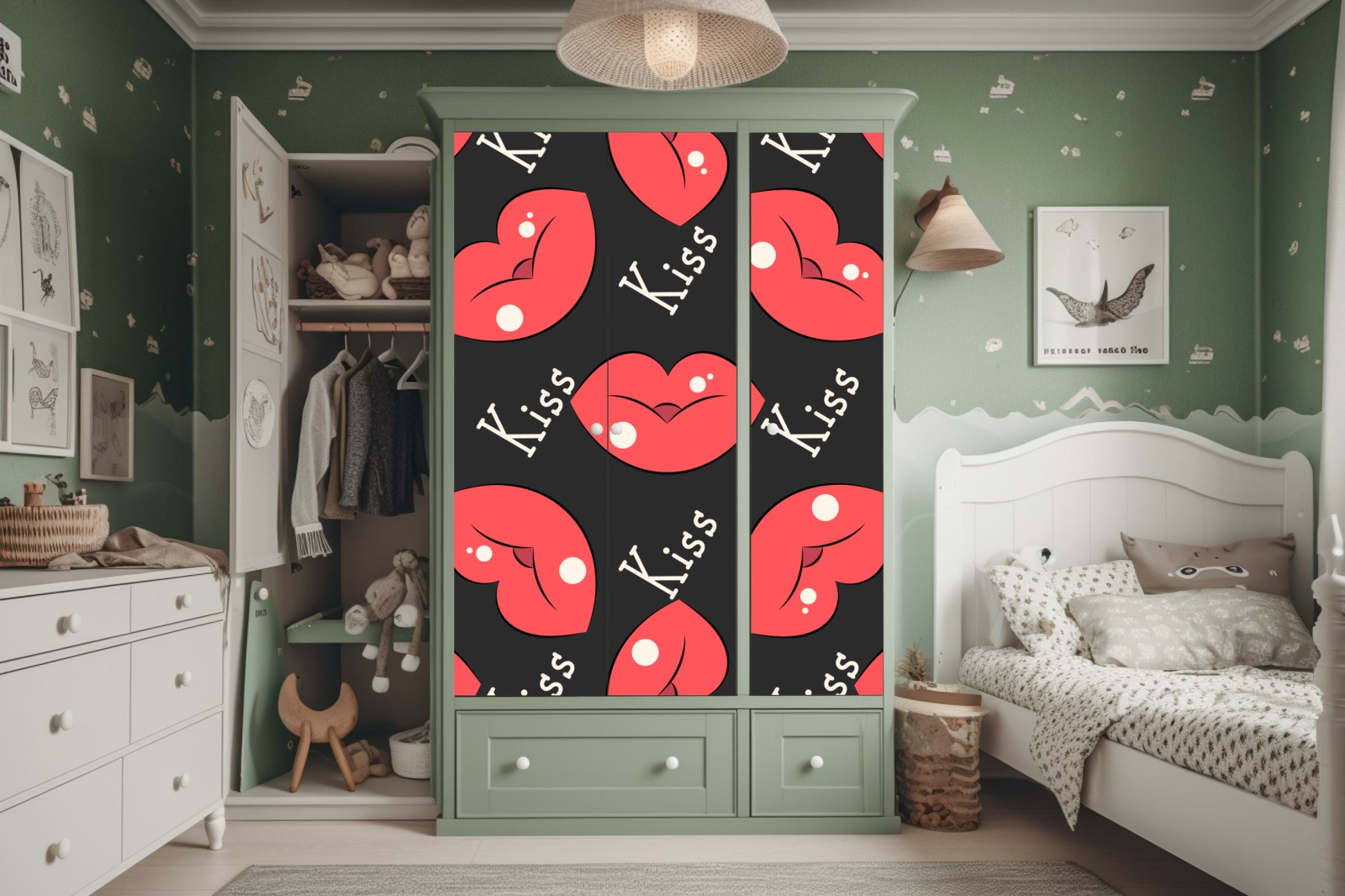 Kräftige rosa Lippen und der Schriftzug 'Kiss' bilden ein verspieltes, zeitgemäßes Muster, das Schlafzimmer und kreative Räume belebt.