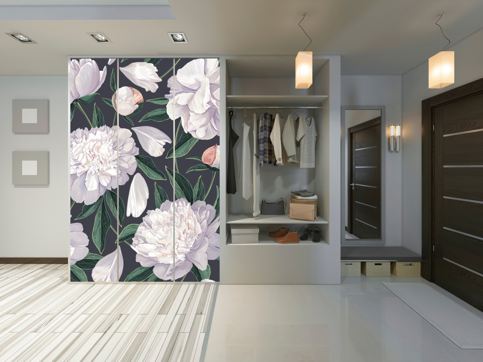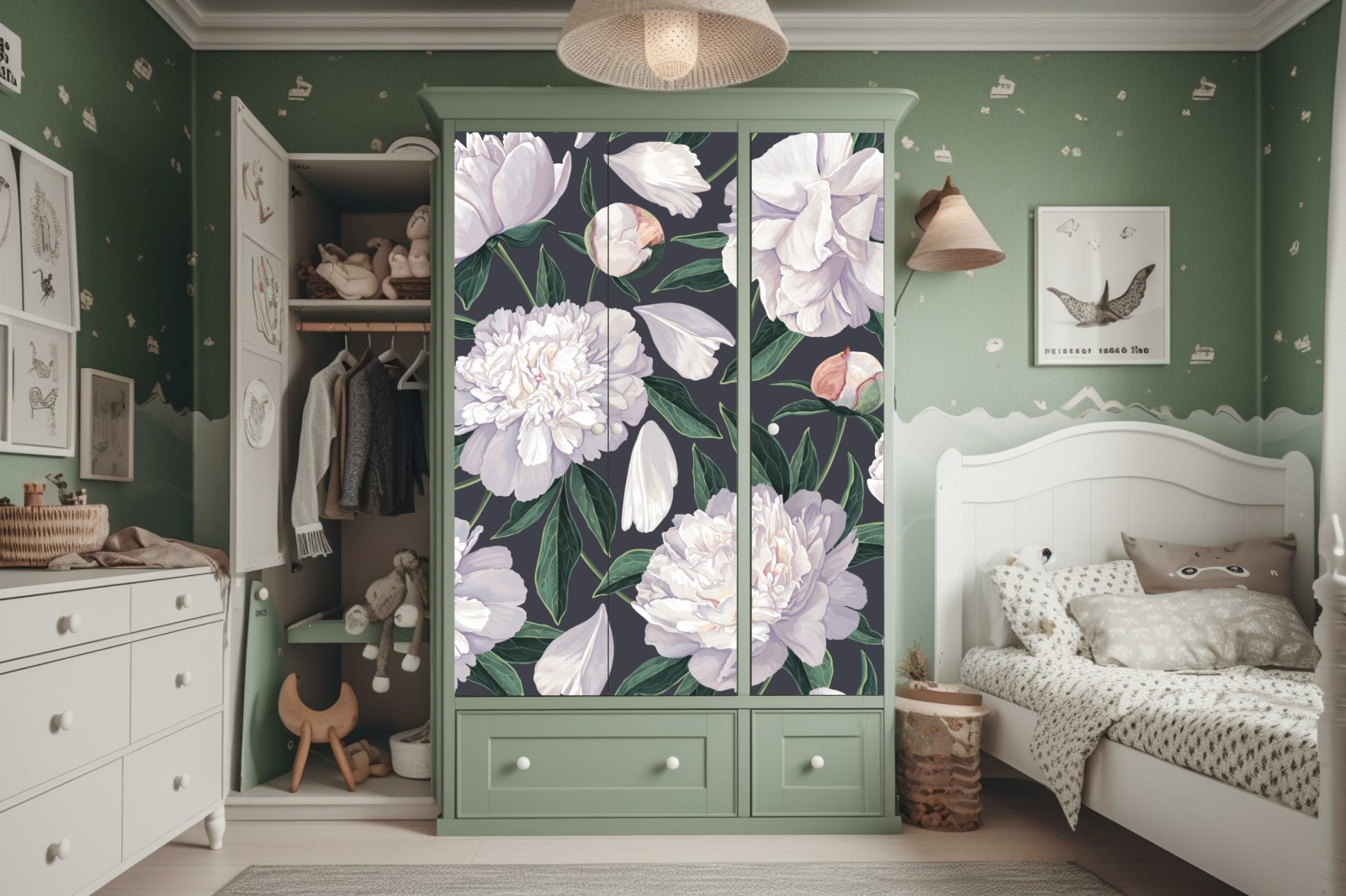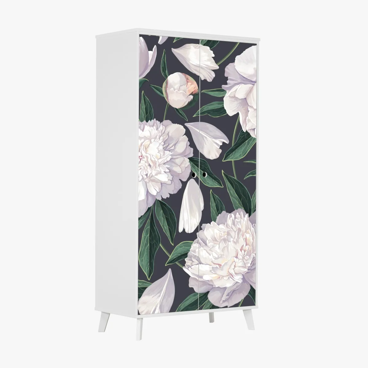 Schrankaufkleber weißes pfingstrosenmuster auf schiefergrauem hintergrund