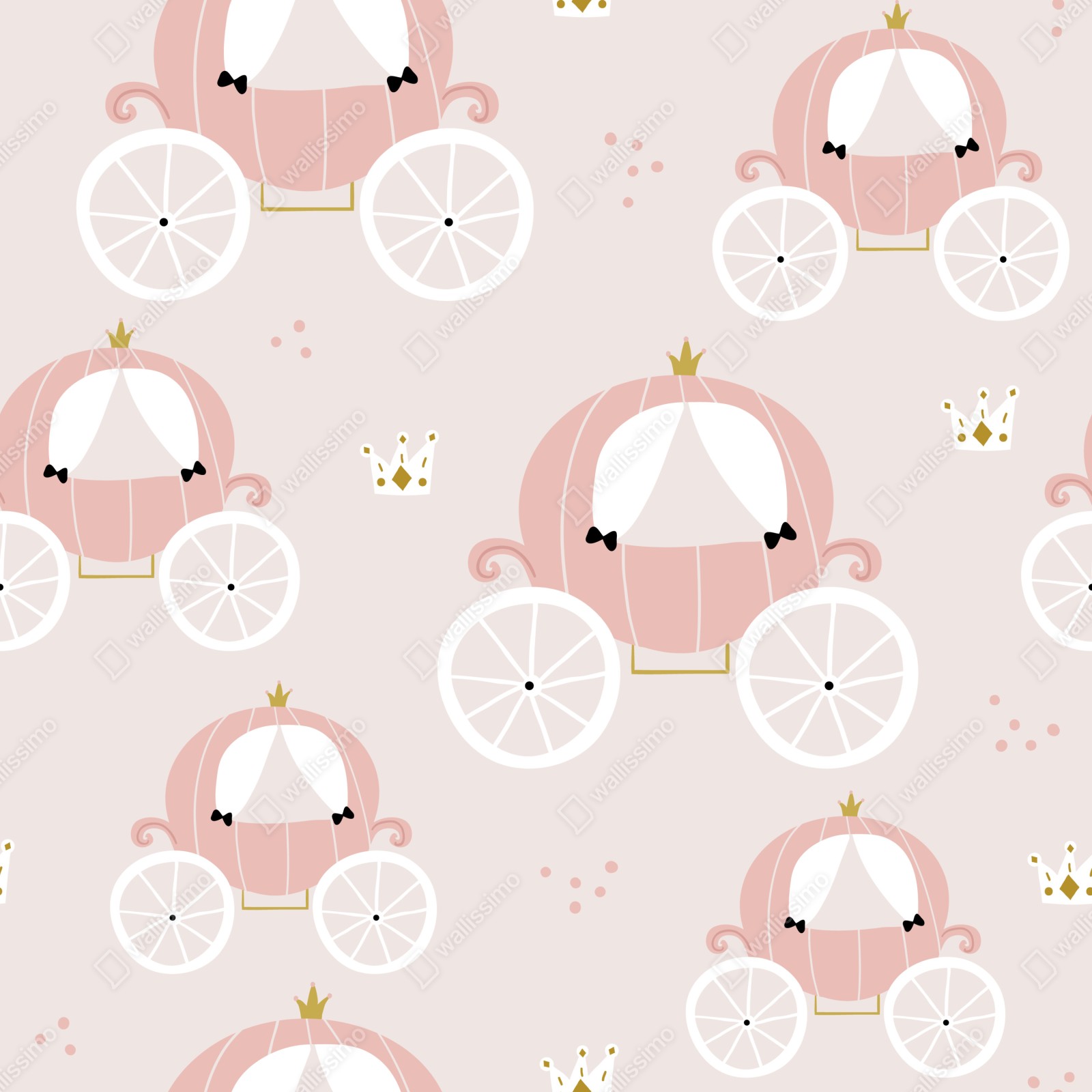 Charmantes pastellfarbenes Muster mit Prinzessinnenkutschen in sanften Rosatönen und goldenen Akzenten, ideal für ein verspieltes Kinderzimmer.