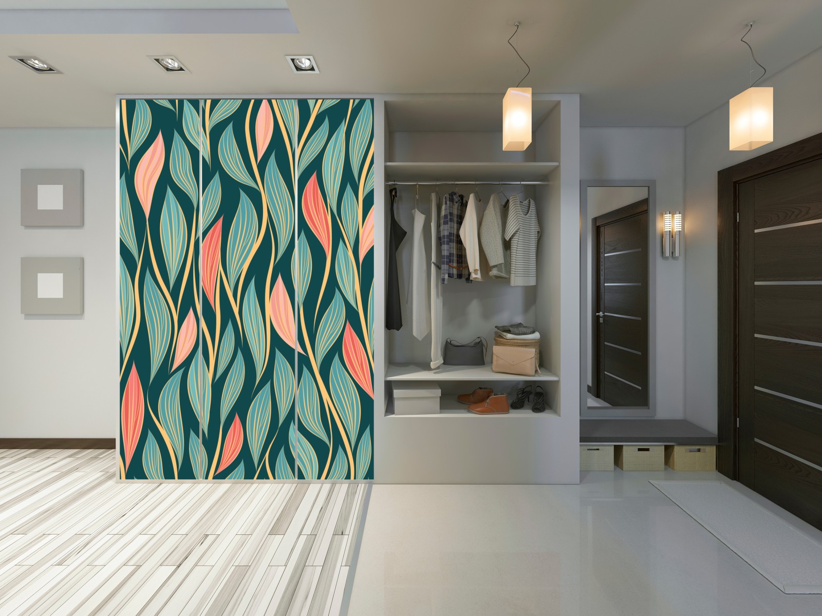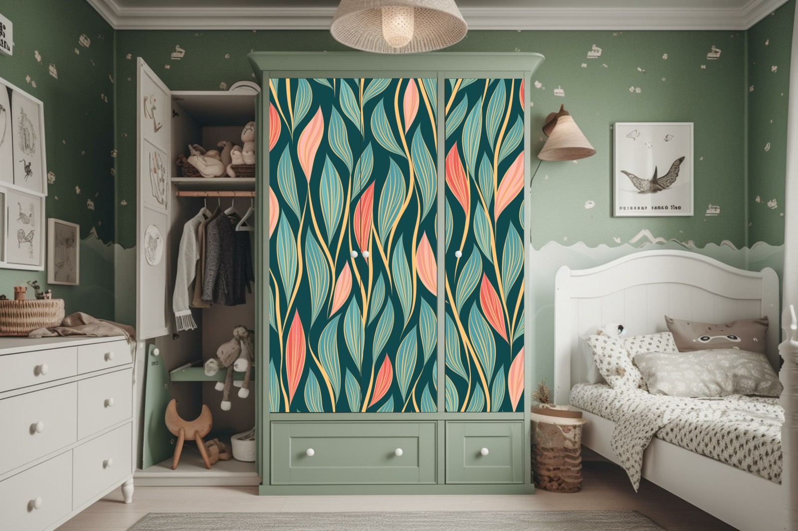 Schrankaufkleber botanisches blattmuster in türkis und koralle