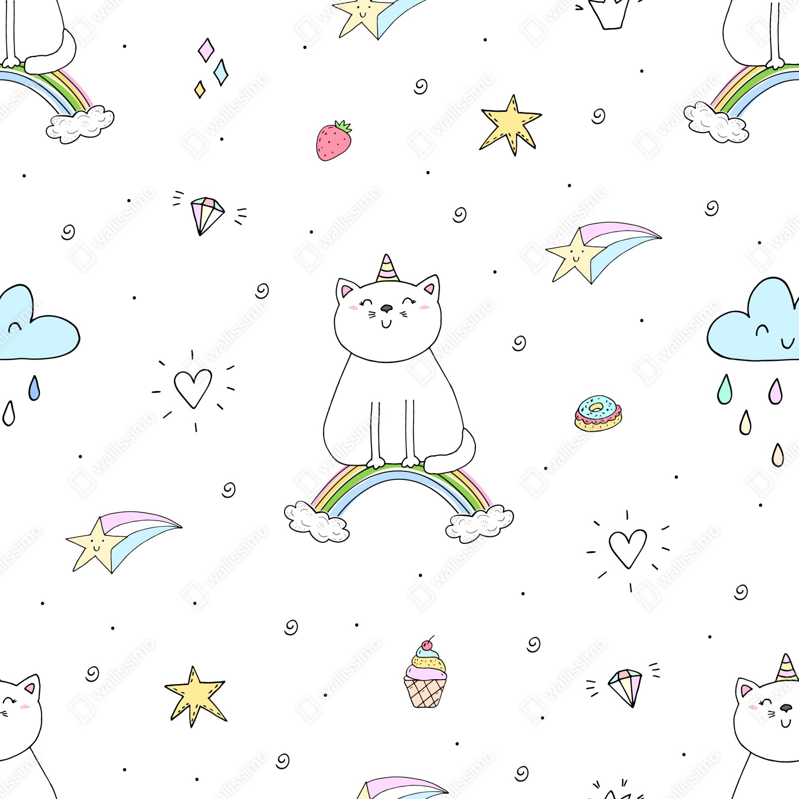 Charmante Pastellillustration mit lächelnden Einhornkatzen, Regenbögen und Süßigkeiten, die jedes Kinderzimmer aufhellt.