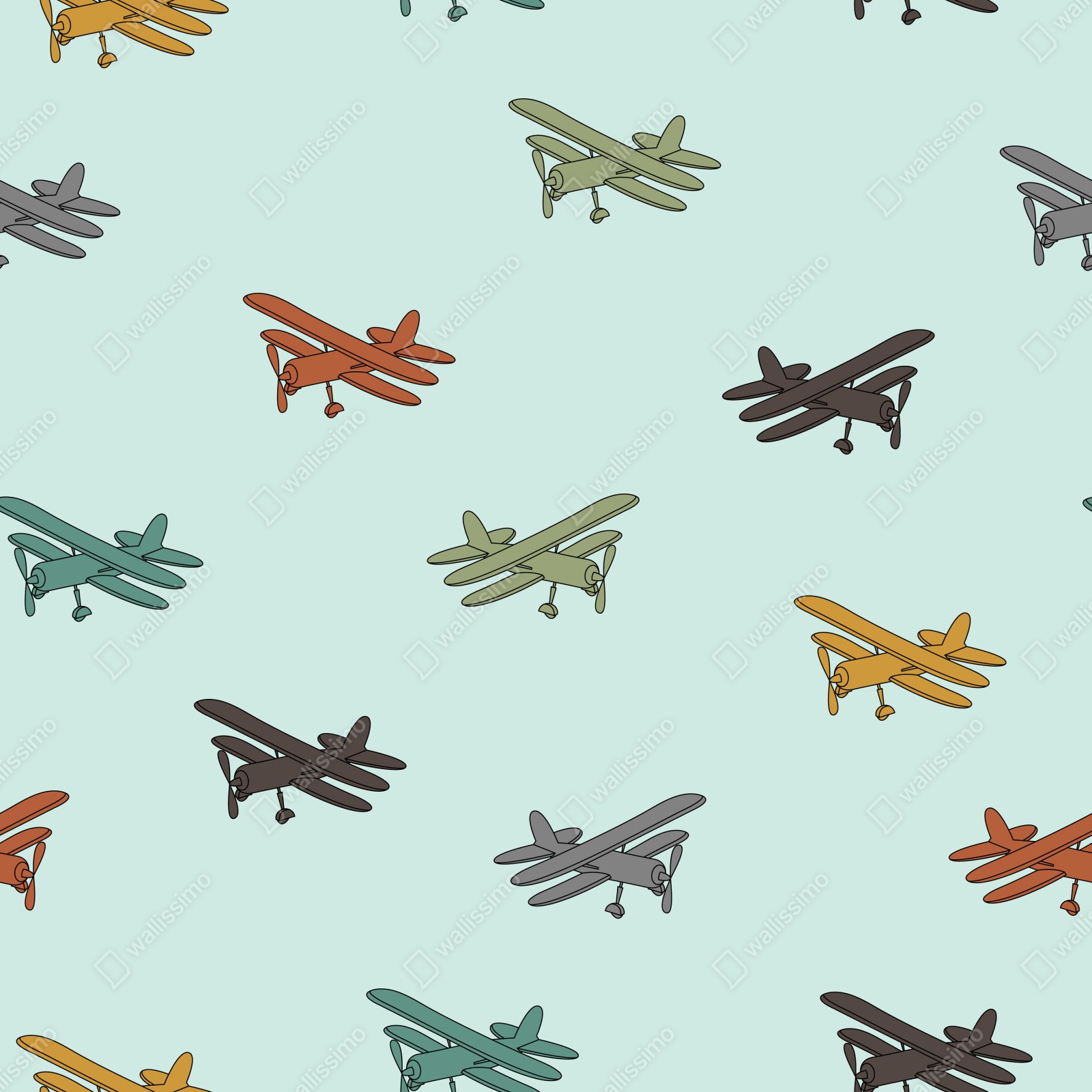 Verspieltes Muster mit Doppeldeckern in pastellfarben, ideal für Kinderzimmer und Kindergarten.