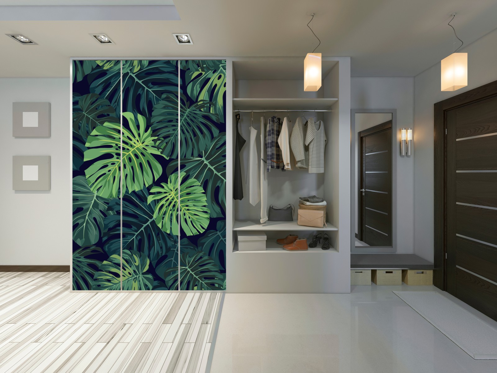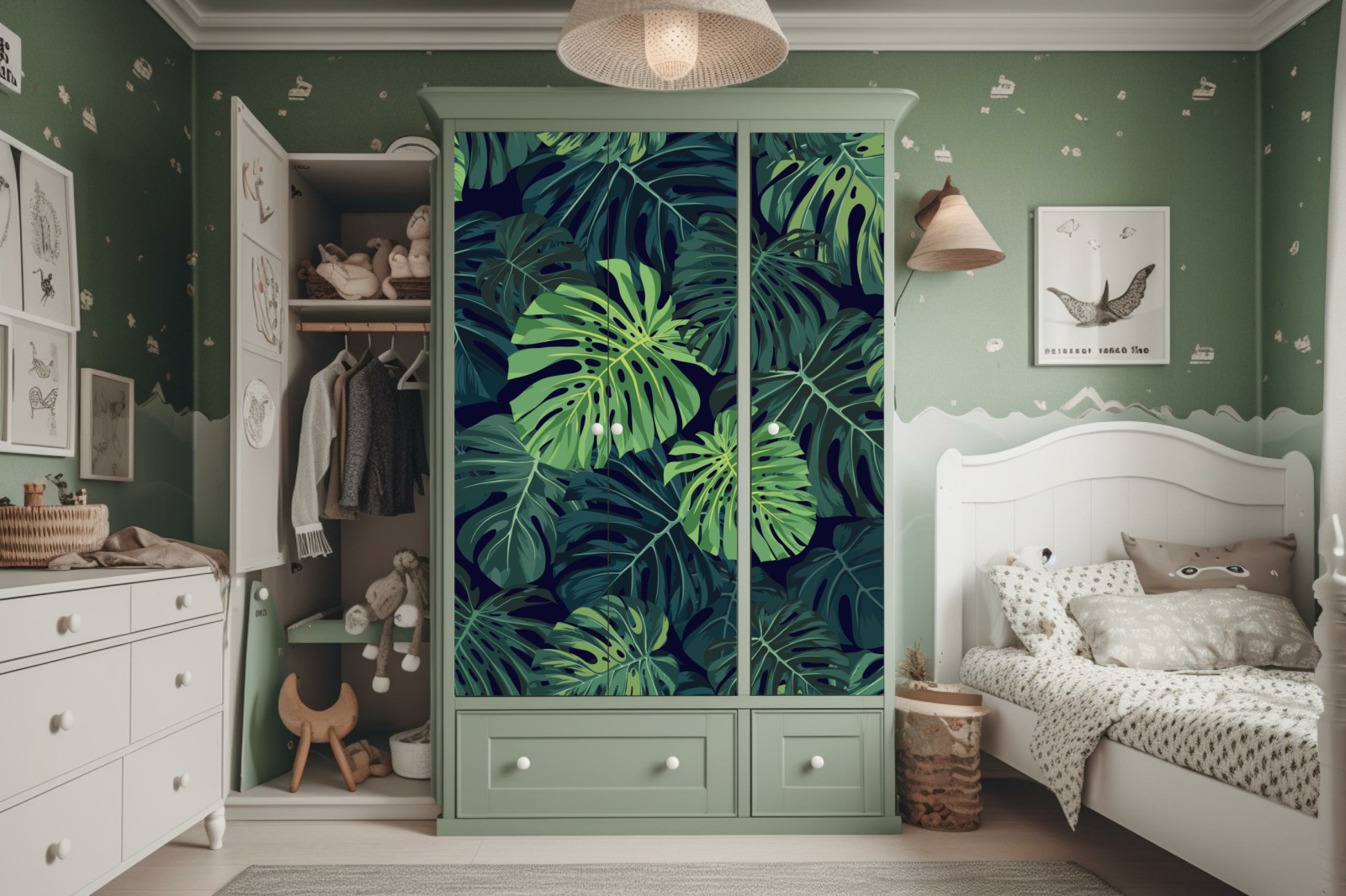 Üppiges Muster aus Monstera-Blättern bringt leuchtendes Grün und natürliche Atmosphäre in jeden Raum und eignet sich ideal als biophiles Highlight.
