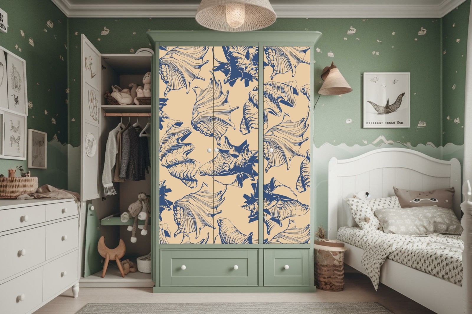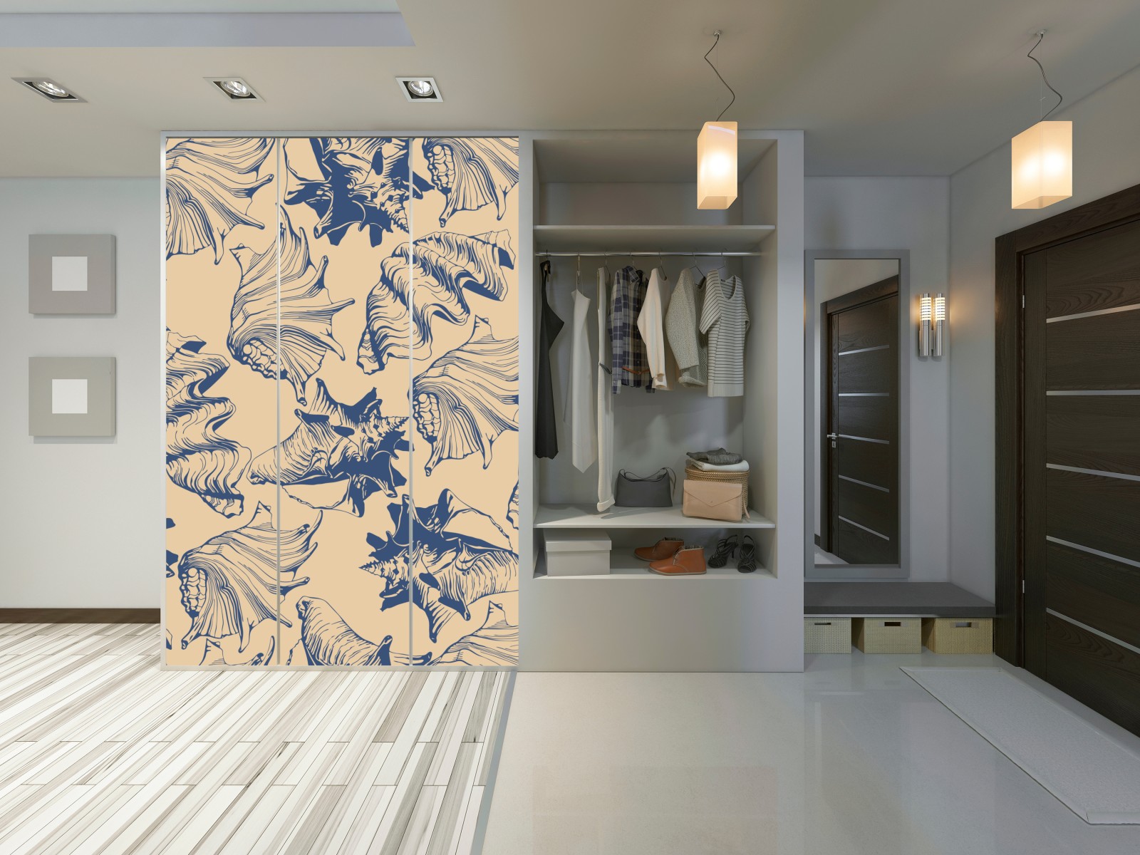 Elegantes Muschelmuster in Blau und Beige verleiht Räumen maritimes Flair und eignet sich perfekt als dekoratives Element für Wände und Stoffe.