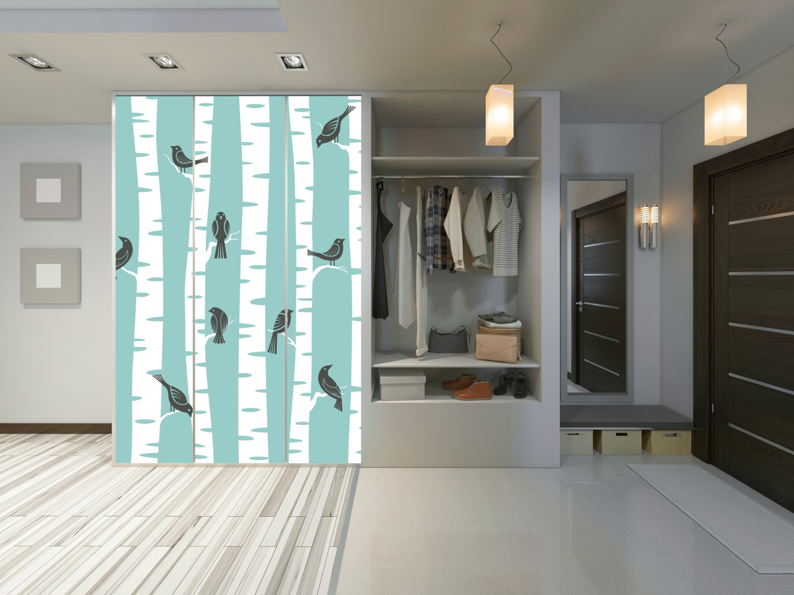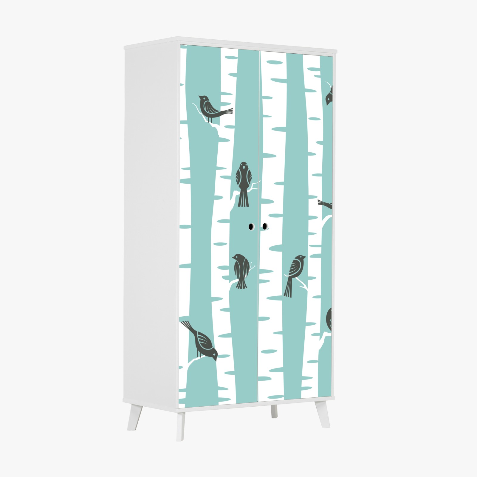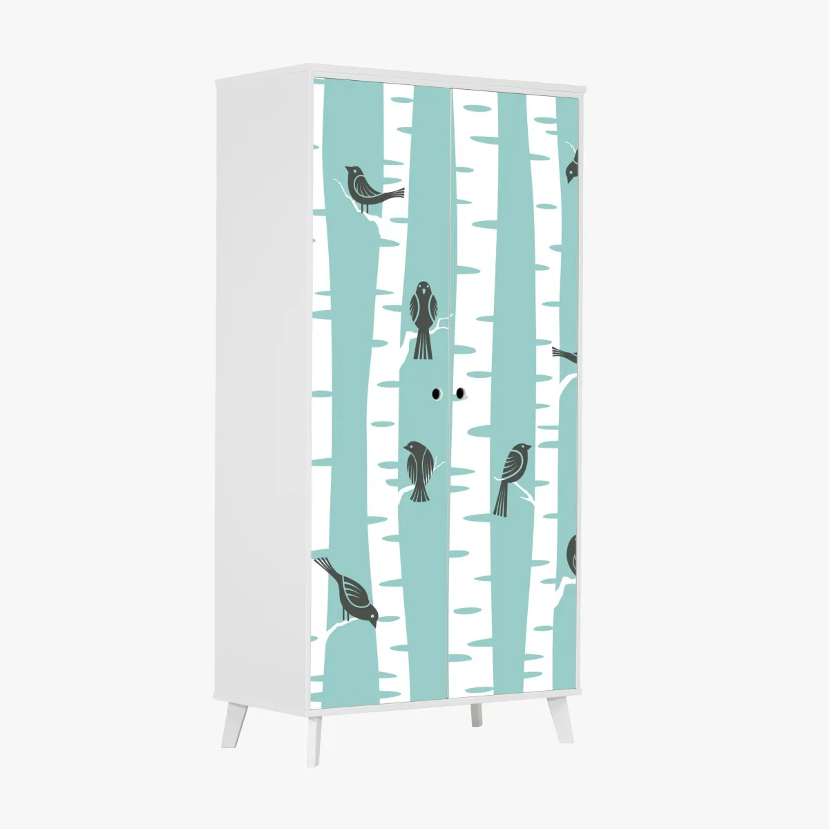 Charmantes, vom skandinavischen Stil inspiriertes Muster aus Birken und Vögeln in sanftem türkis und grau bringt ruhige, verspielte Atmosphäre ins Kinderzimmer oder Wohnzimmer.