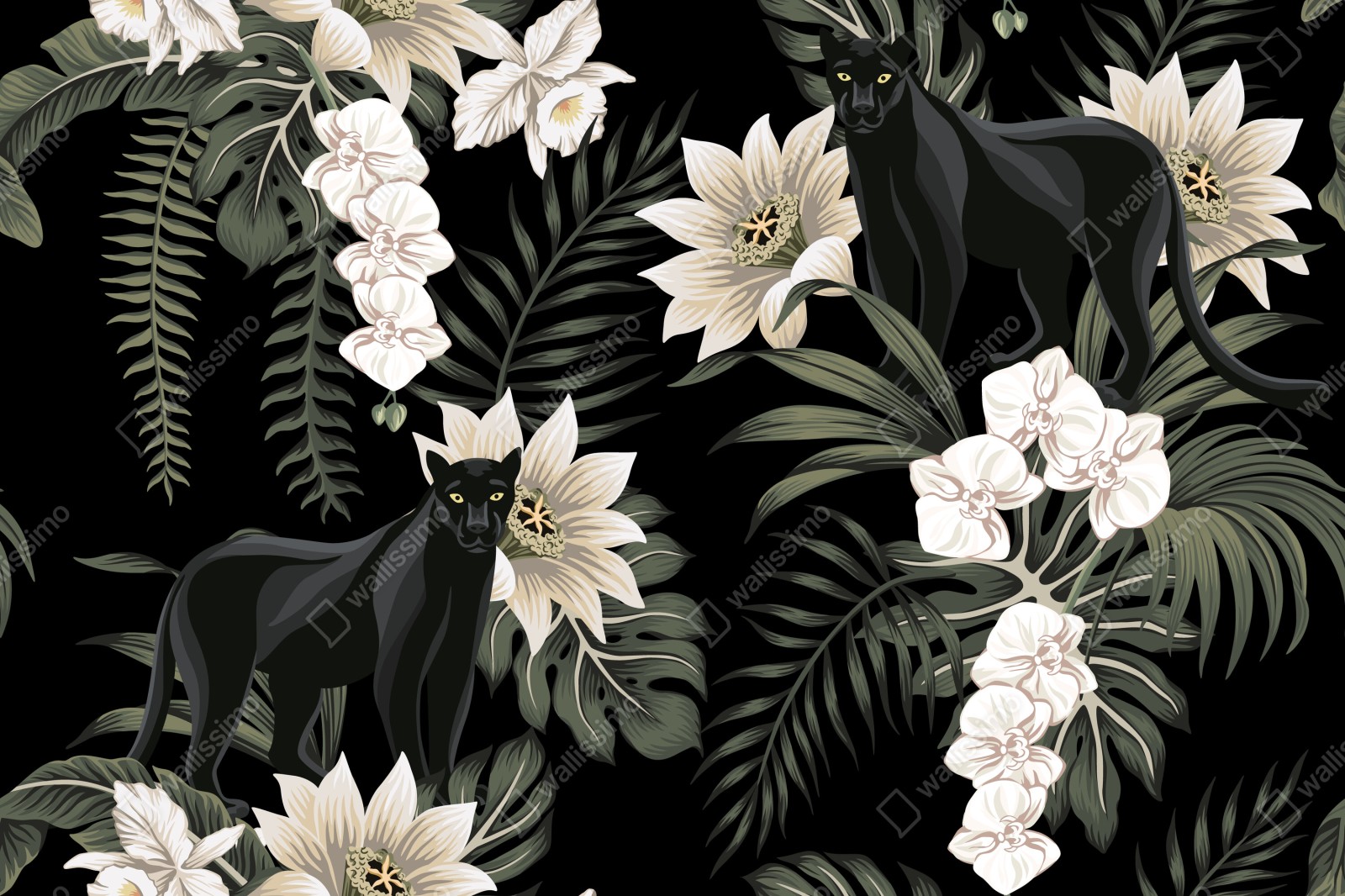 Ein kräftiges botanisches Motiv mit schwarzen Panthern und cremefarbenen Orchideen auf tiefschwarzem Hintergrund, ideal, um jedem Raum tropische Dramatik zu verleihen.