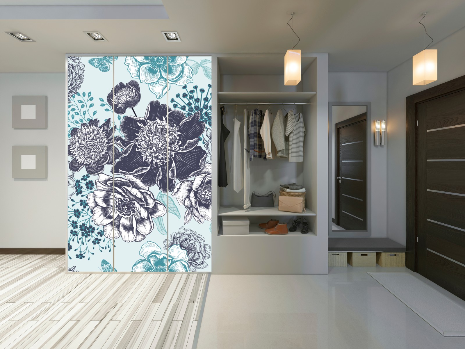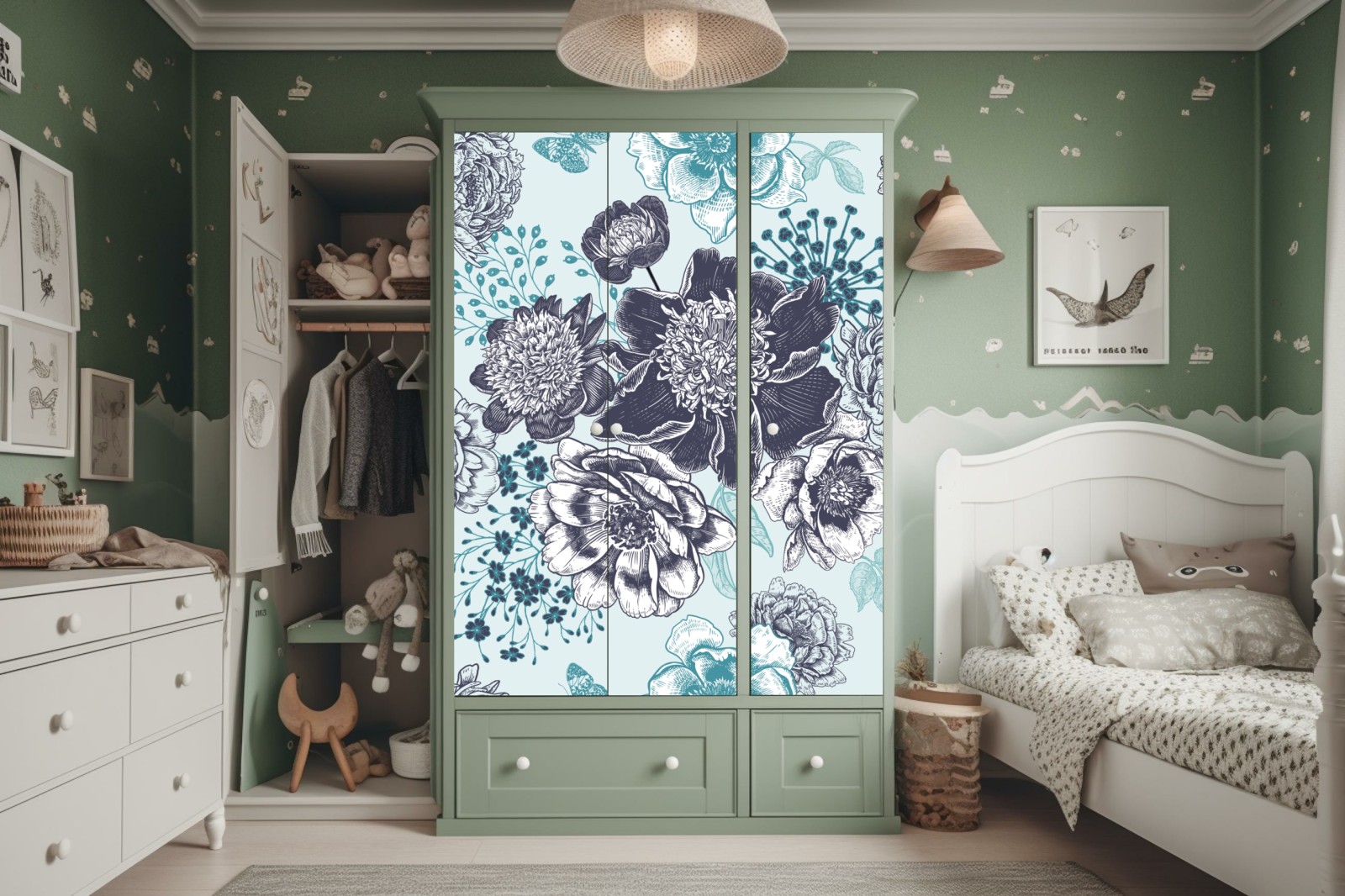 Schrankaufkleber blumiges peonienmuster in türkis und marineblau