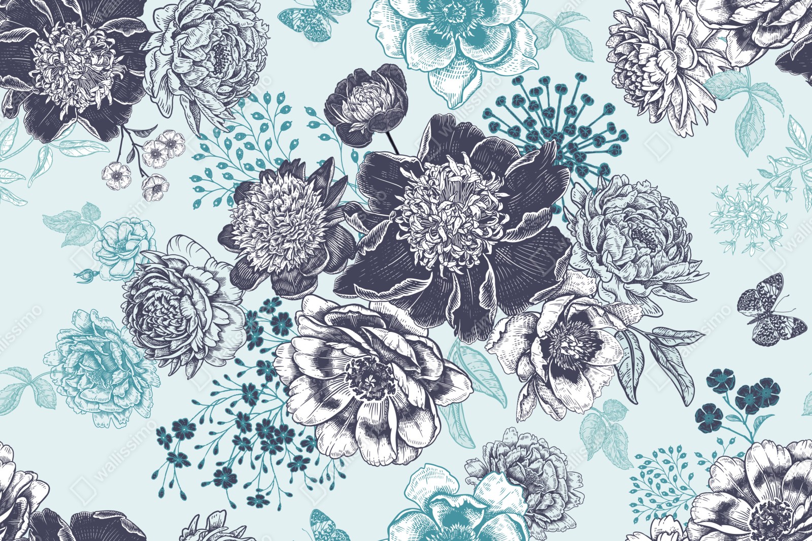zarte retro-blumenillustration in weichen türkis- und marineblau-tonen, die einem interieur einen romantischen, zeitlosen akzent verleiht.
