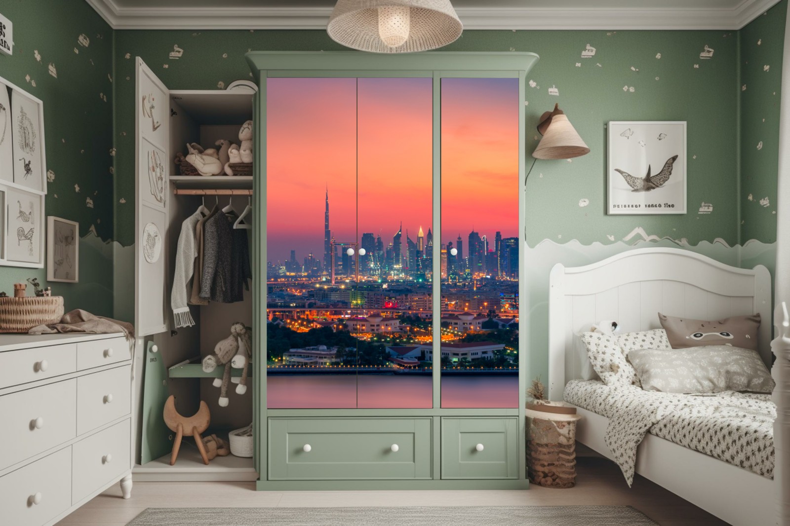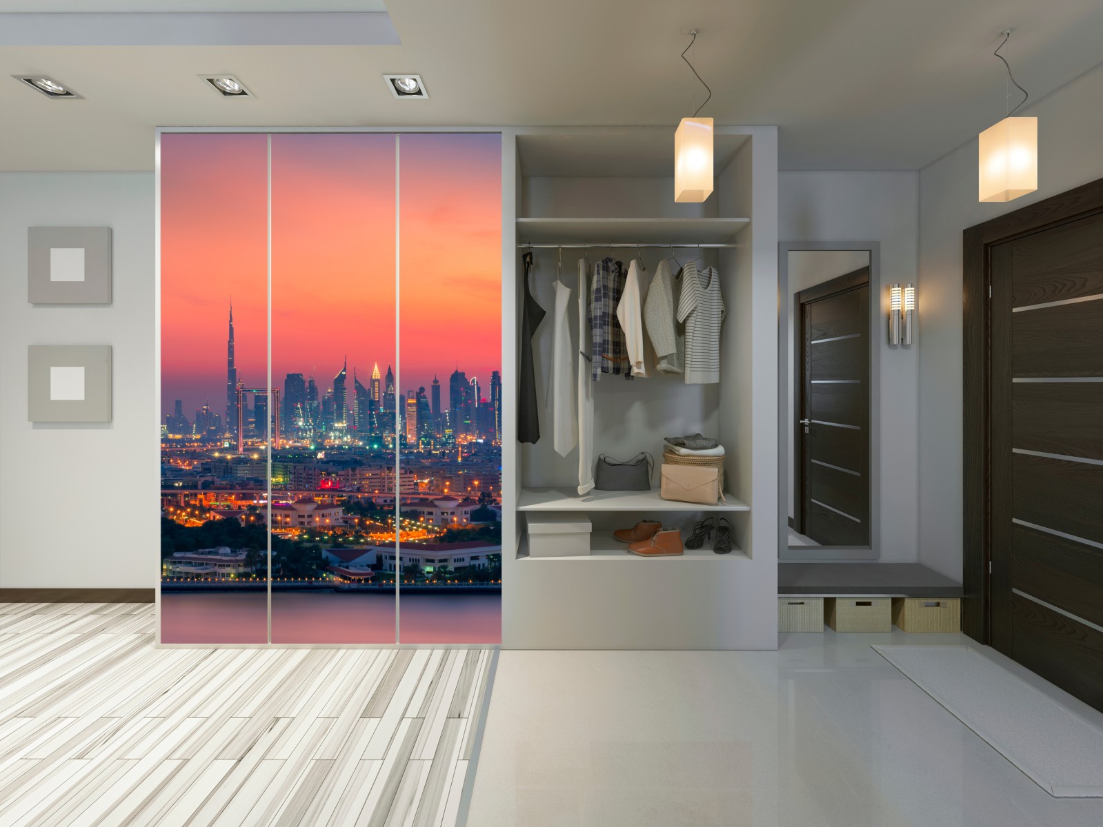 Ein lebendiges Panorama der Skyline von Dubai bei Sonnenuntergang, das warme Farben und Stadtlichter kombiniert und jeden Raum zum Blickfang macht.
