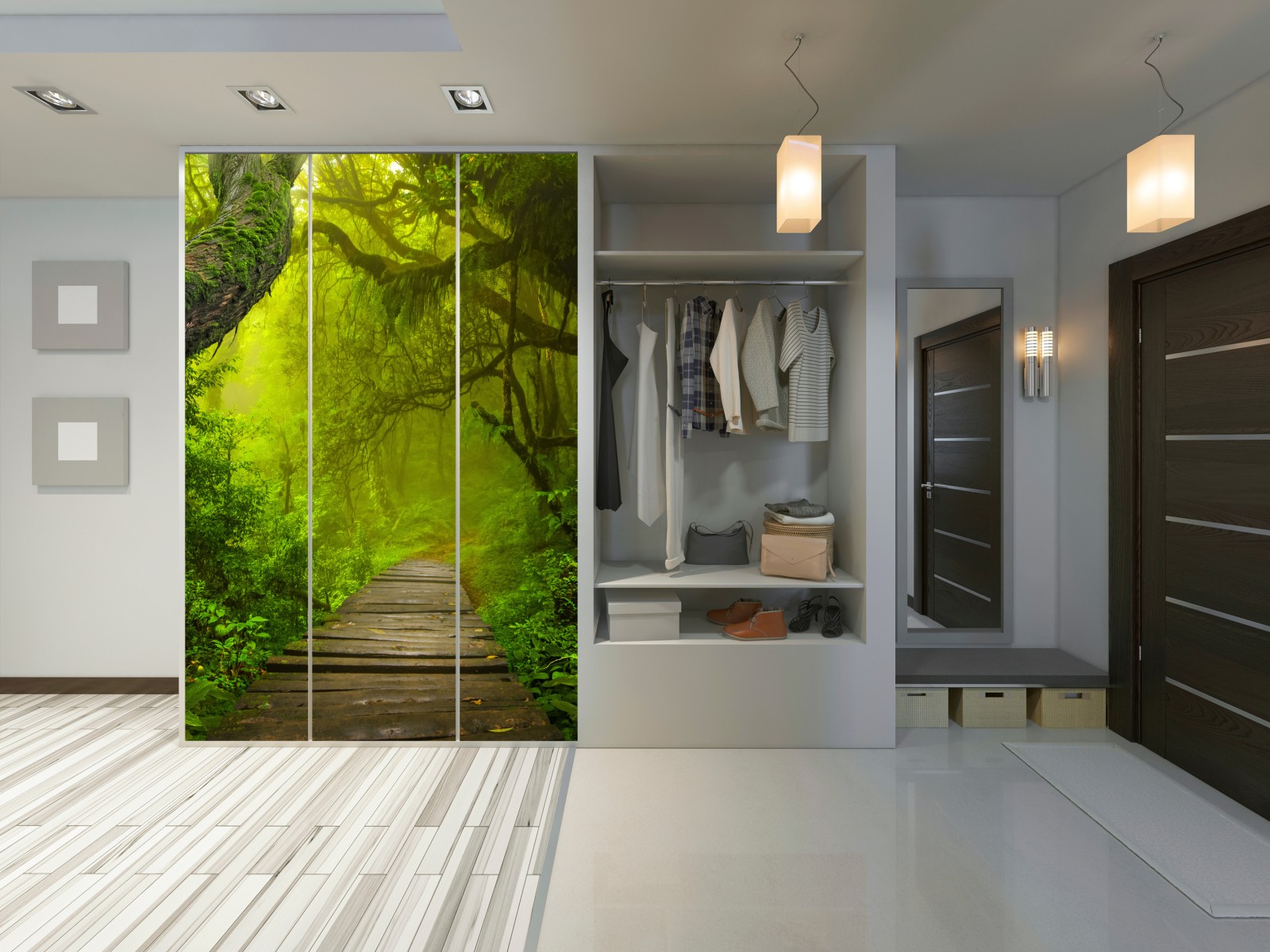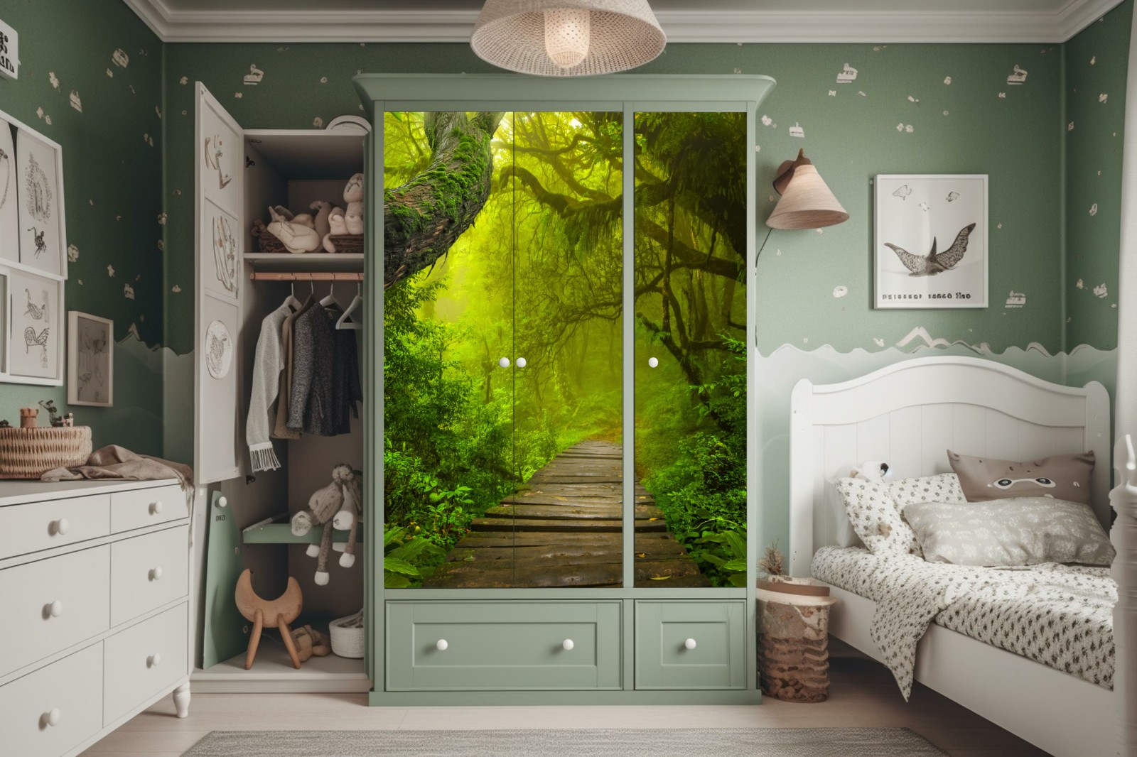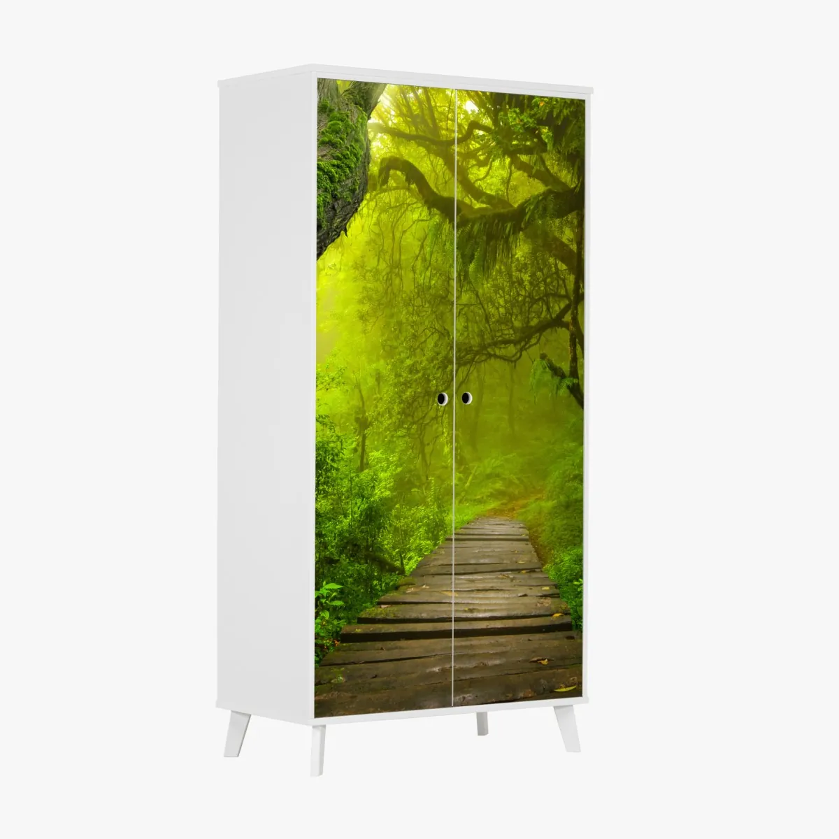 Ein ruhiger Blick auf einen üppigen grünen Wald mit einem hölzernen Weg im Nebel, ideal um natürliche Ruhe in Ihr Zuhause zu bringen.