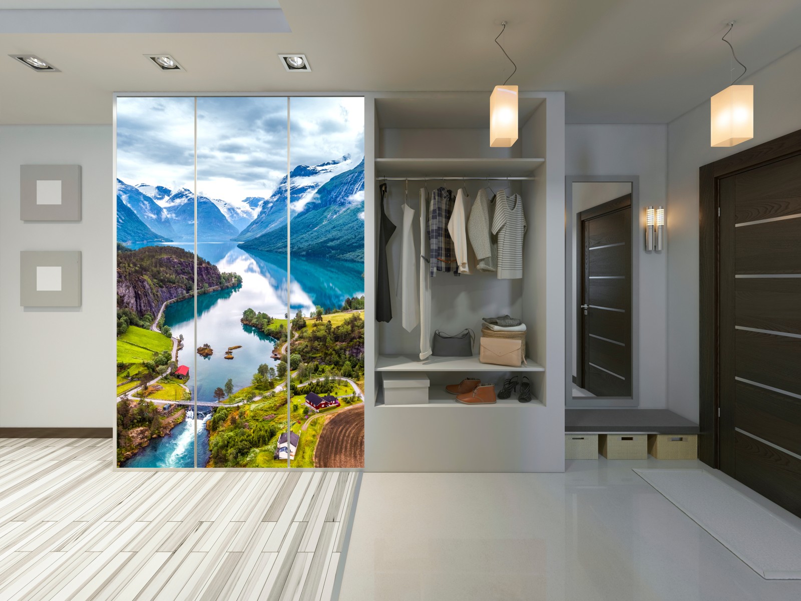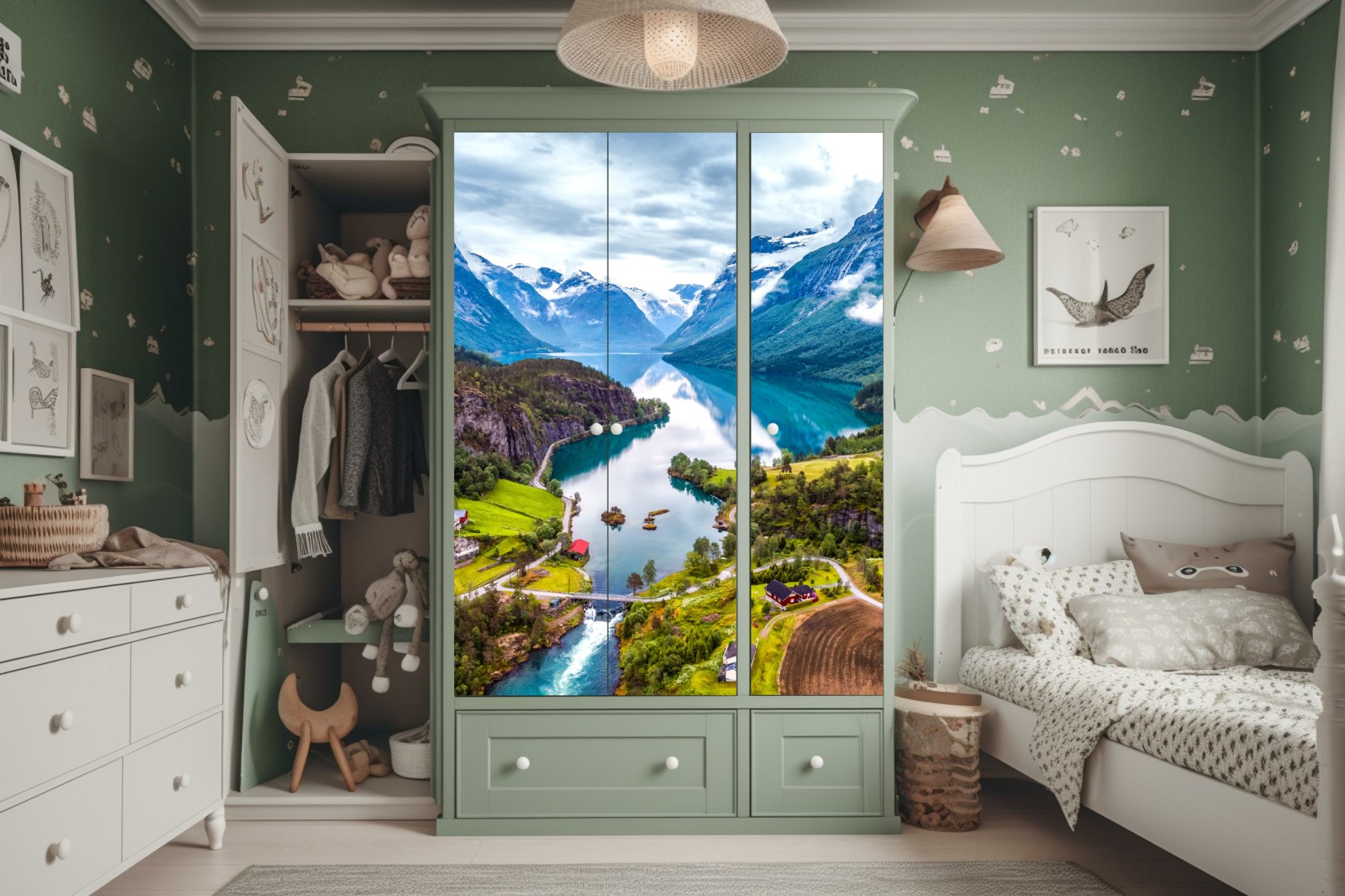 Atemberaubende Luftaufnahme eines norwegischen Fjords mit türkisblauem Wasser und imposanten Bergen, ideal um natürliche Ruhe in jeden Raum zu bringen.
