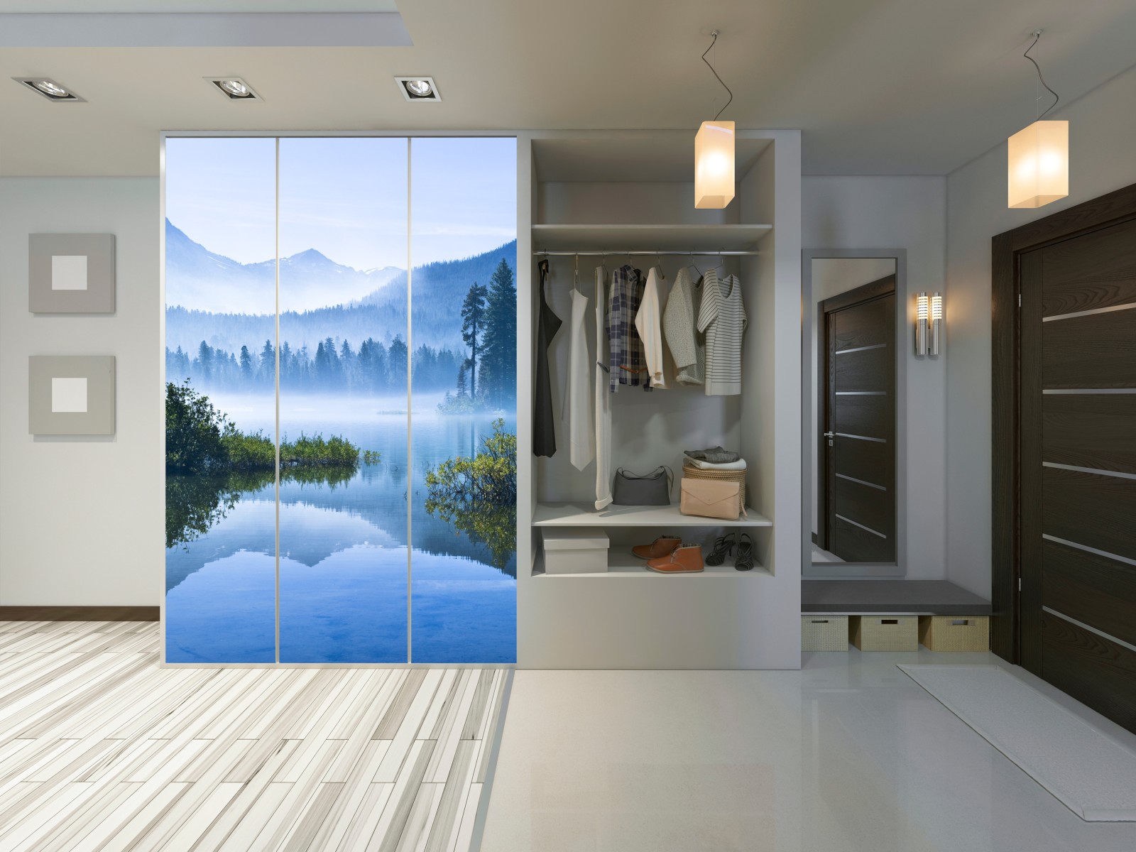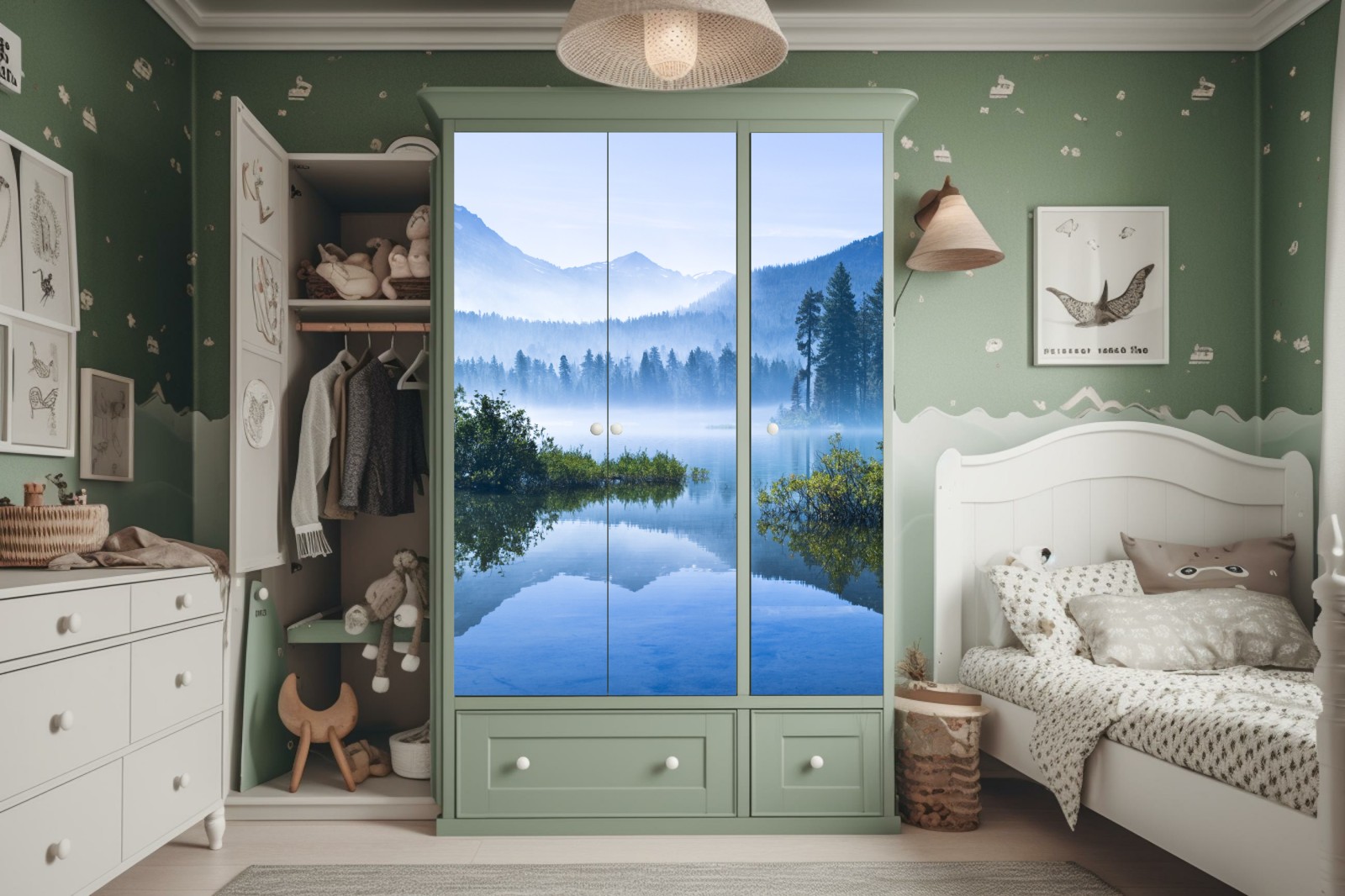 Schrankaufkleber nebliger bergsee mit spiegelnder oberfläche