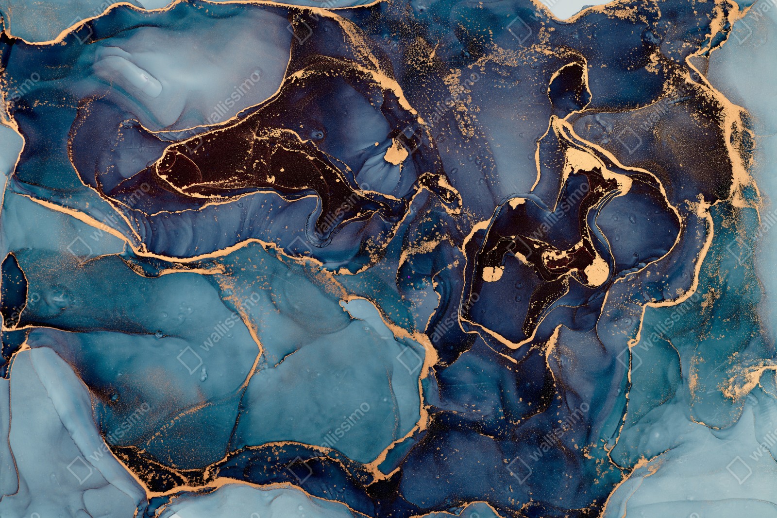 Luxuriöse abstrakte Fluidkunst in tiefen Blautönen mit goldenen Akzenten, die modernen Stil und ruhige Bewegung in jeden Raum bringt.