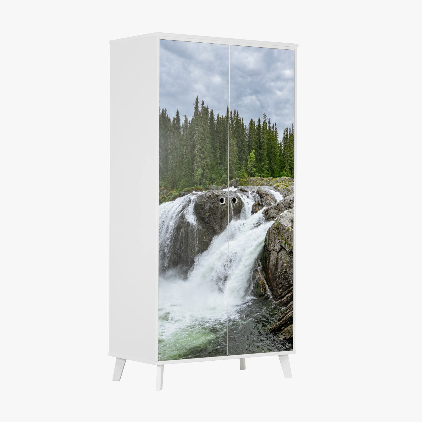 Schrankaufkleber Nebliger wasserfall im dichten kiefernwald