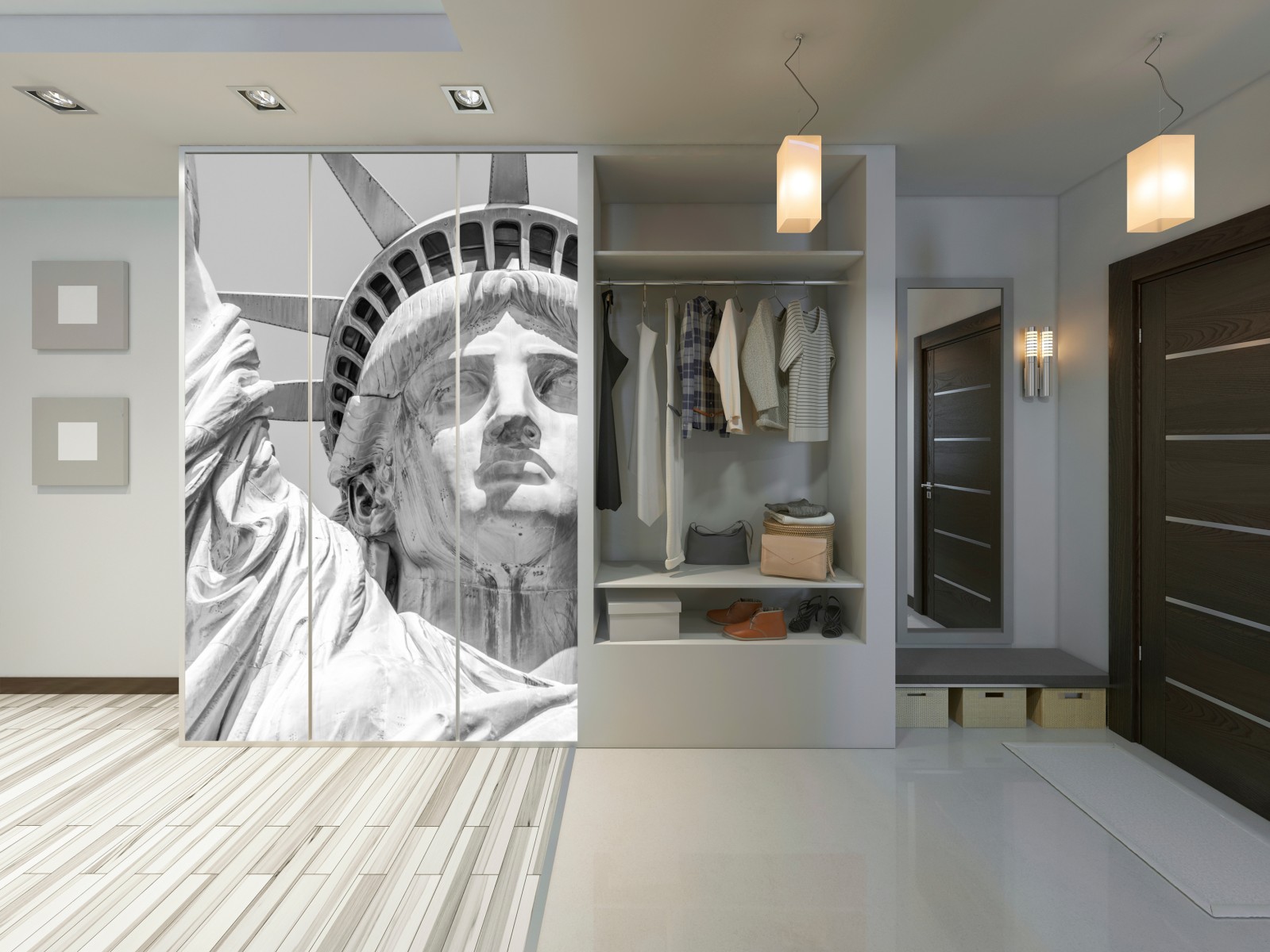 Markante Schwarzweiß-Nahaufnahme der Freiheitsstatue, die architektonische Details und zeitlose Symbolik in moderne Innenräume bringt.