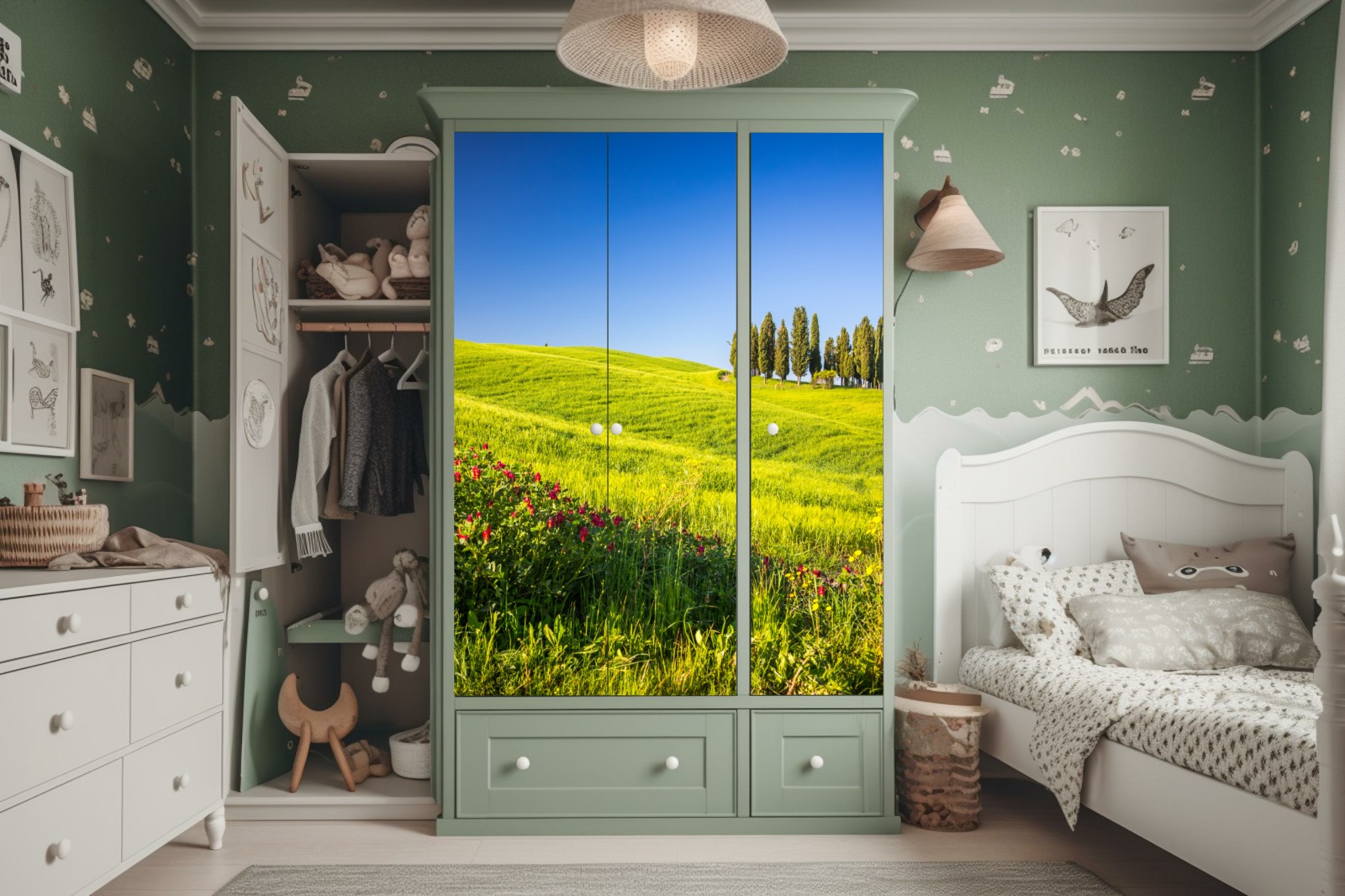 Ein ruhiges Panorama aus sonnenbeschienenen, sanften Wiesen mit Zypressen und bunten Wildblumen, ideal um natürliche Frische an die Wand zu bringen.
