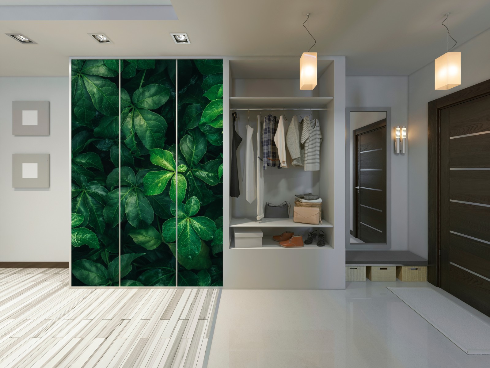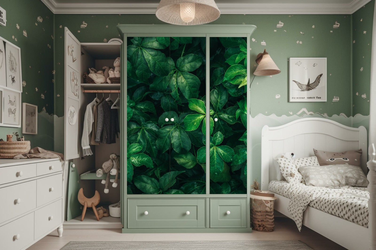 Nahaufnahme tropischer Blätter mit Regentropfen, die eine beruhigende, natürliche Atmosphäre und satte Grüntöne in Ihren Raum bringt.