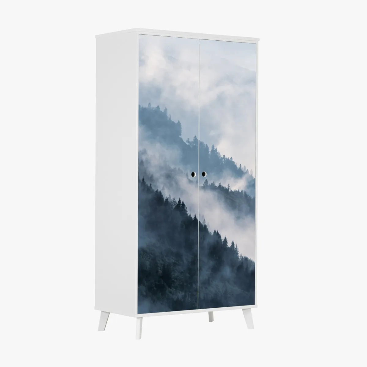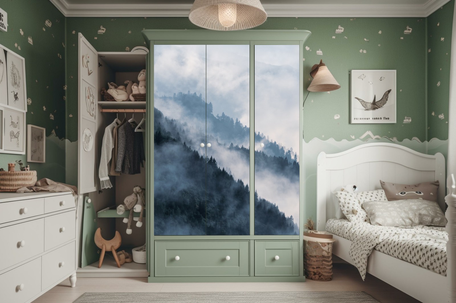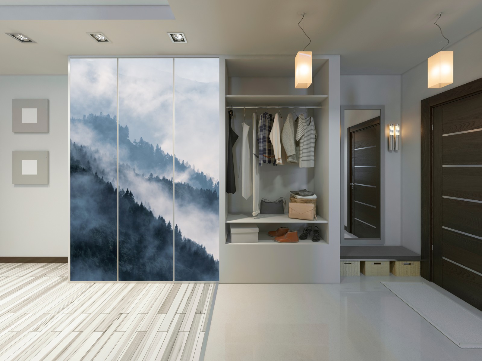 Eine ruhige neblige Berglandschaft, die jedem Raum eine naturverbundene und entspannende Atmosphäre verleiht.