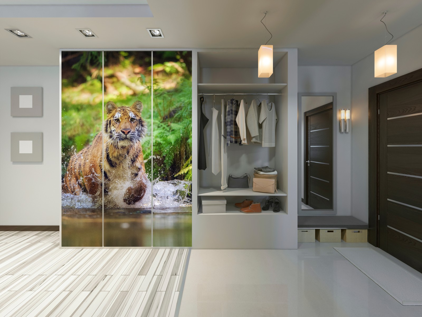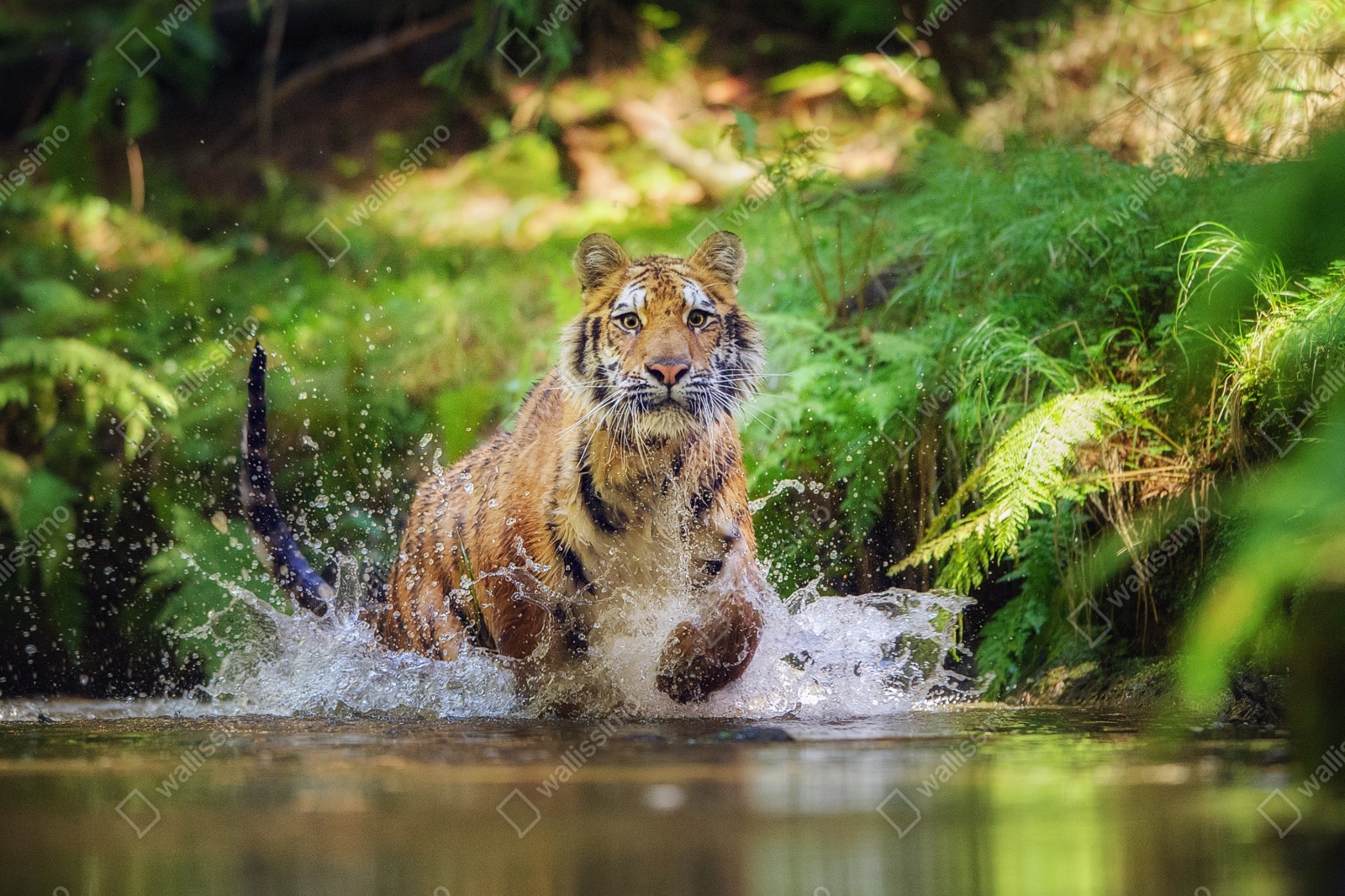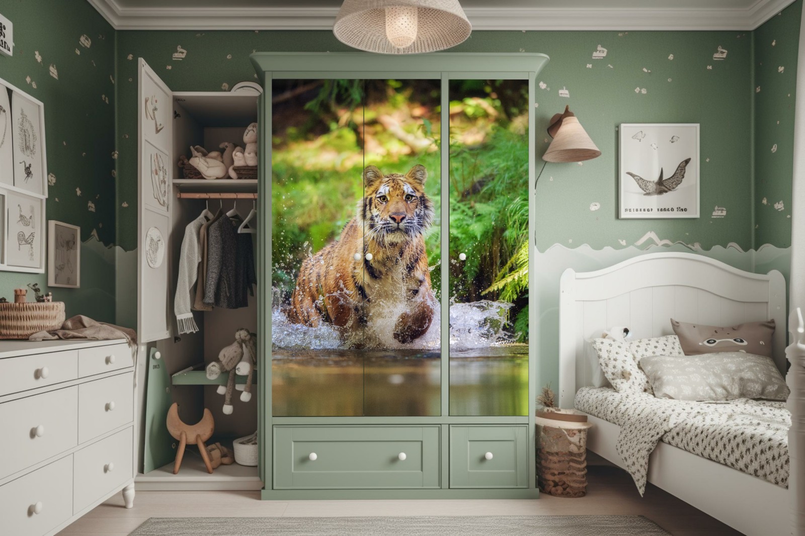 Dramatische Nahaufnahme eines Tigers, der durch einen Waldbach springt, verleiht jedem Raum wilde Energie und natürliche Schönheit.