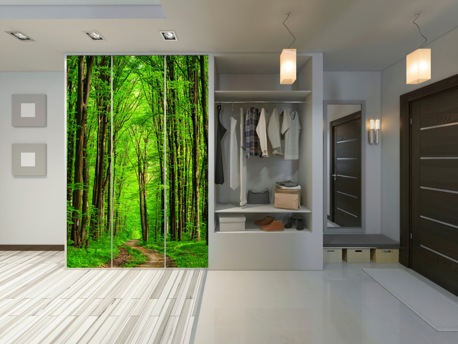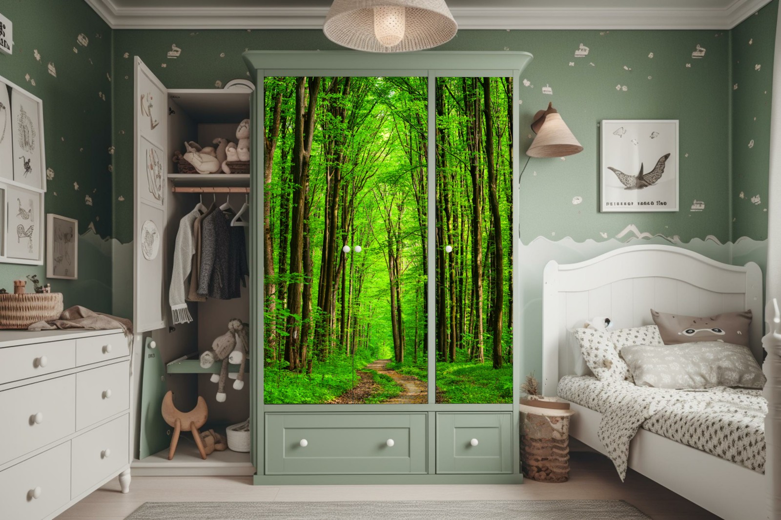 Lebendige Waldszene mit einem sonnenbeschienenen Pfad, die beruhigende Grünflächen und natürliche Tiefe in den Raum bringt.
