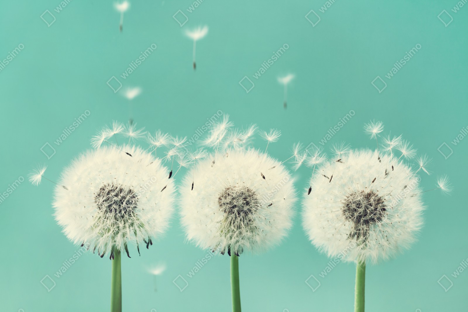 Zarte Pusteblumen schweben vor einem beruhigenden türkisfarbenen Hintergrund und verleihen jedem Raum eine leichte, luftige Atmosphäre.