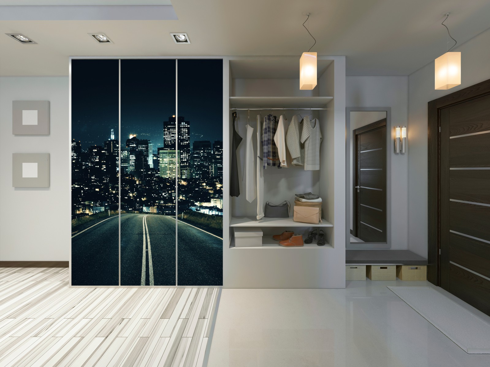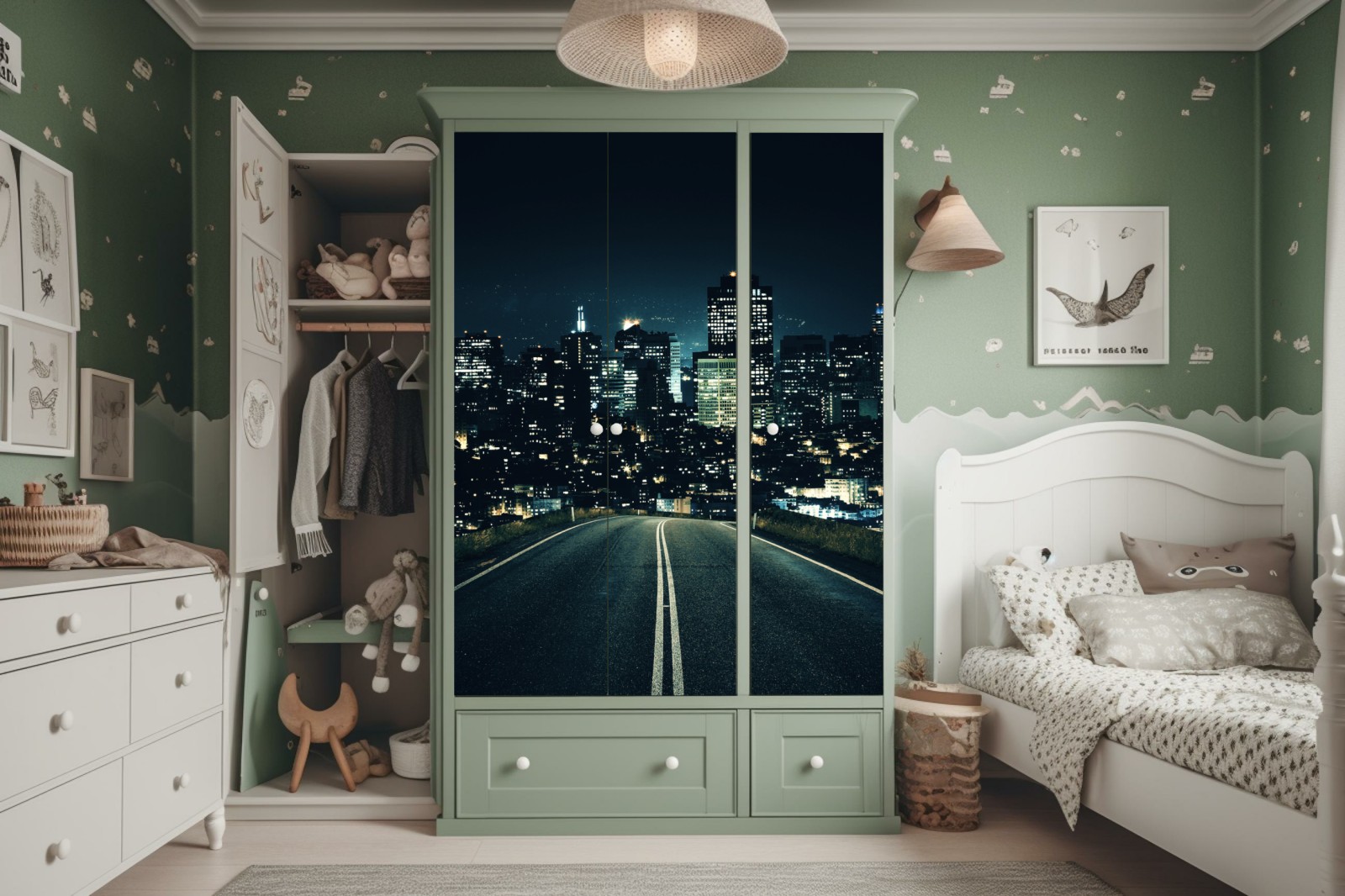 Schrankaufkleber straße zur beleuchteten stadtsilhouette bei nacht