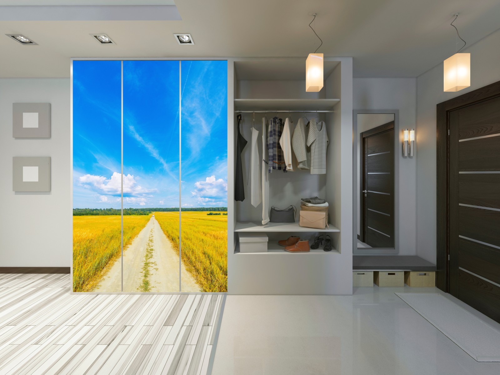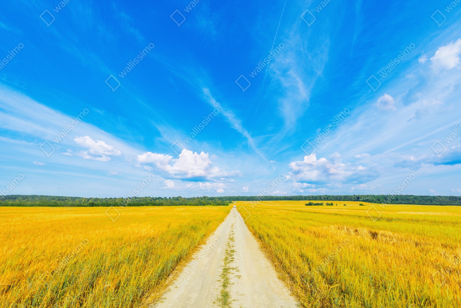 Ein ruhiger Panoramaausblick auf eine goldene Wiese mit einem geraden Feldweg zum Horizont unter klarem blauem Himmel, ideal um natürliche Ruhe in jeden Raum zu bringen.