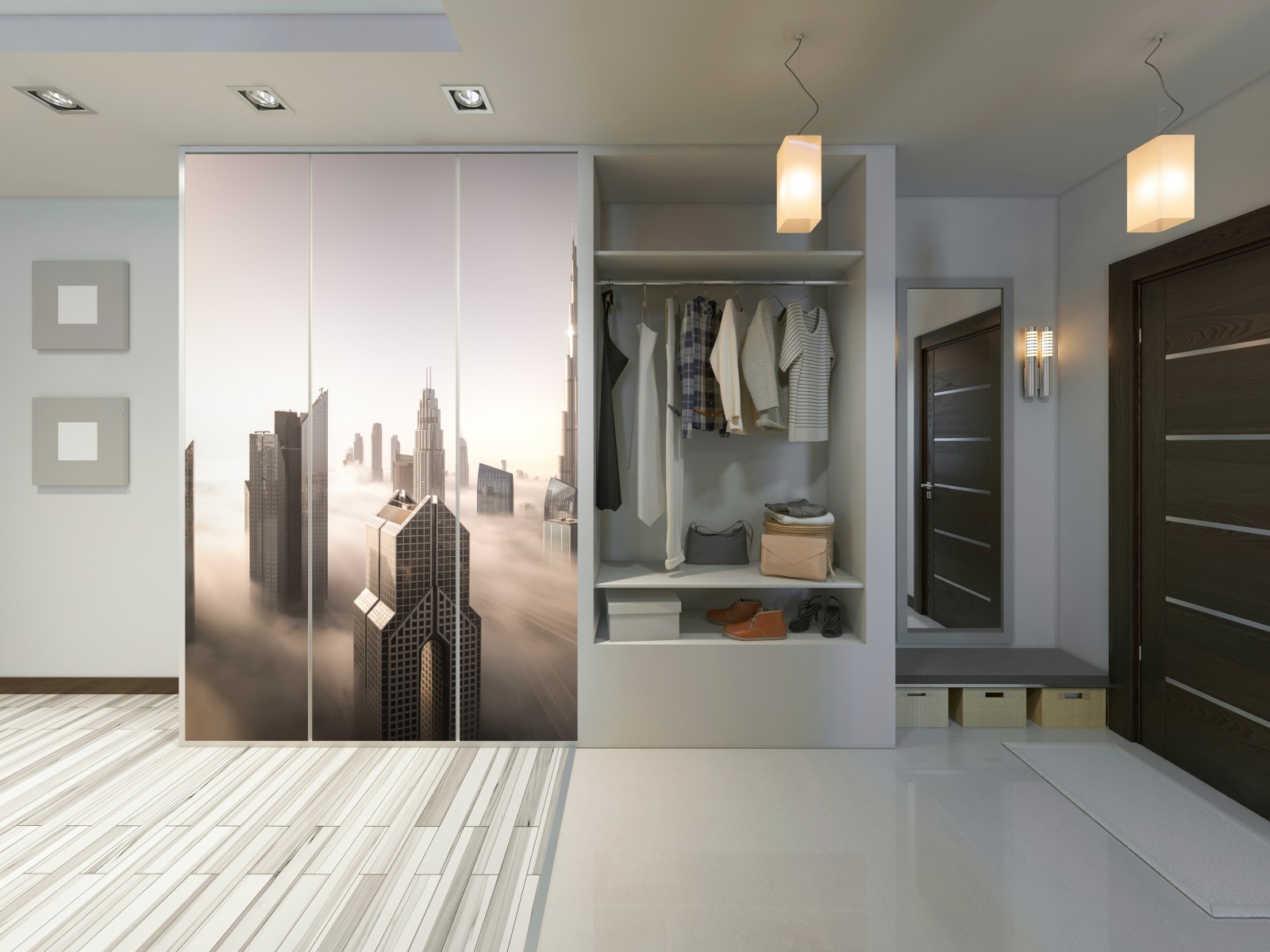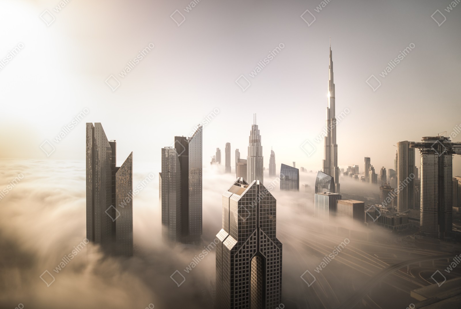 Ruhige Luftaufnahme des Zentrums von Dubai, in der die Wolkenkratzer aus dem Winternebel ragen und eine elegante, beruhigende Wanddekoration bilden.