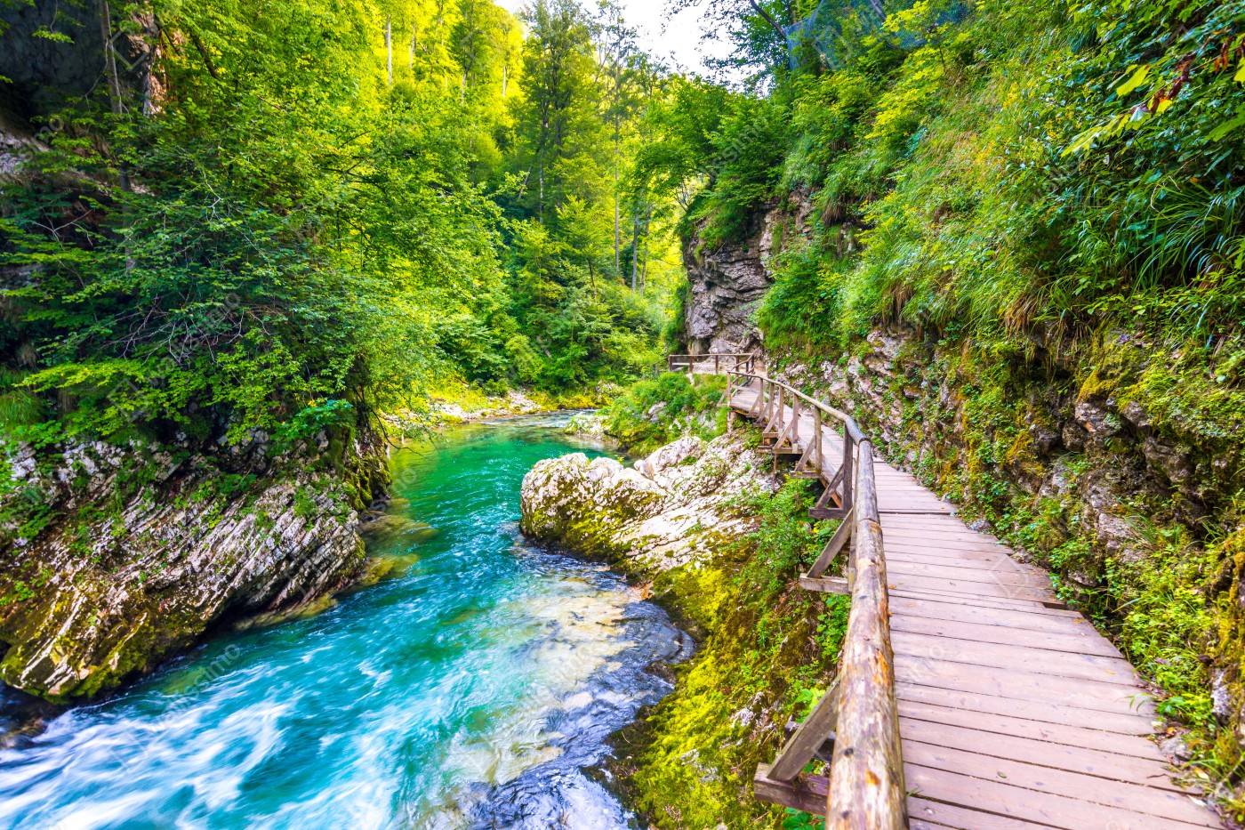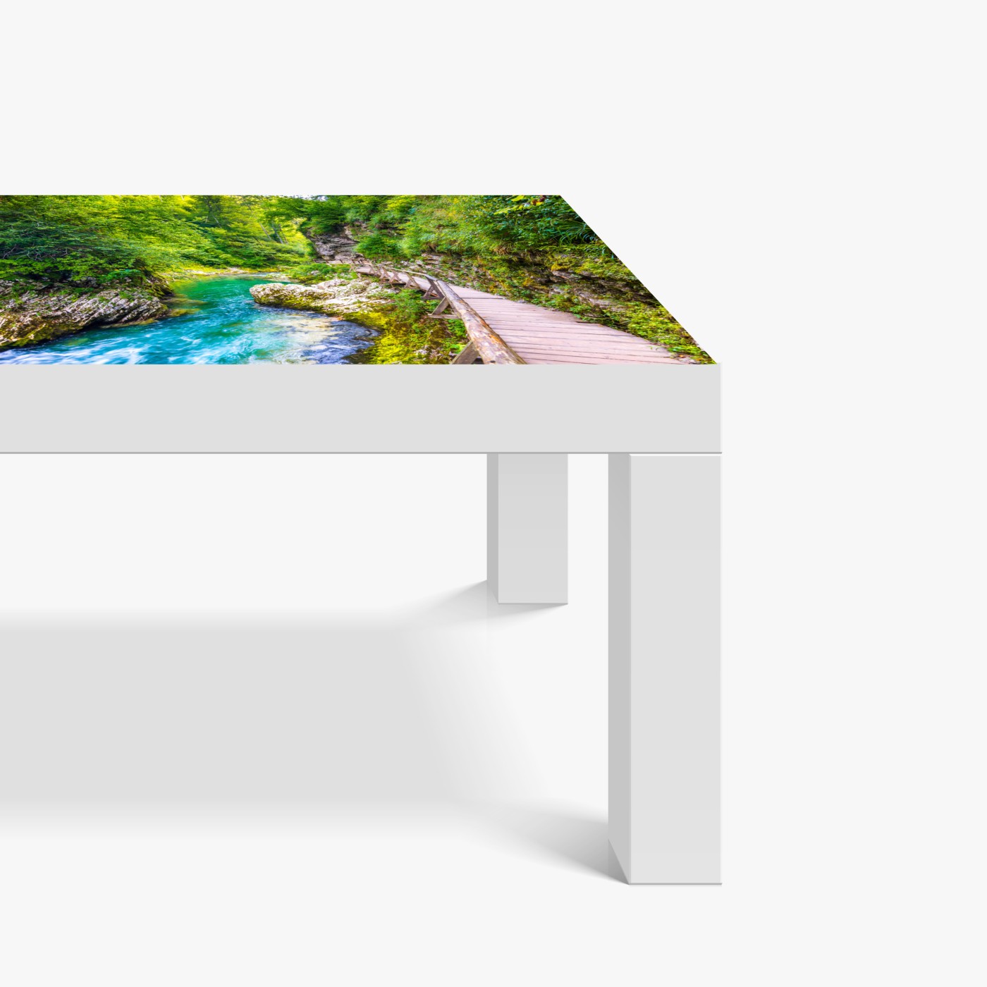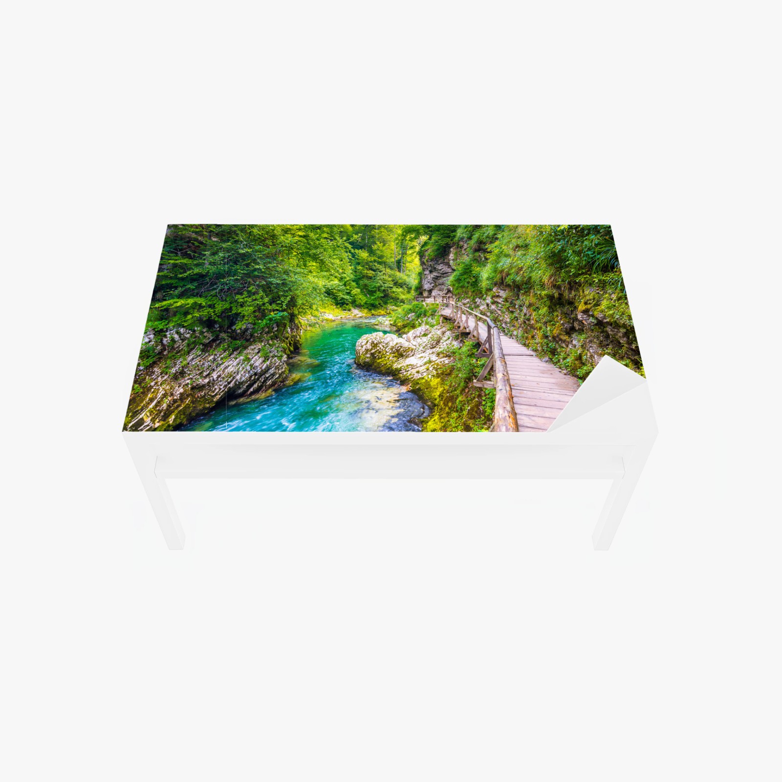 Tischaufkleber und Schreibtischaufkleber Türkisfarbener fluss und holzsteg im wald