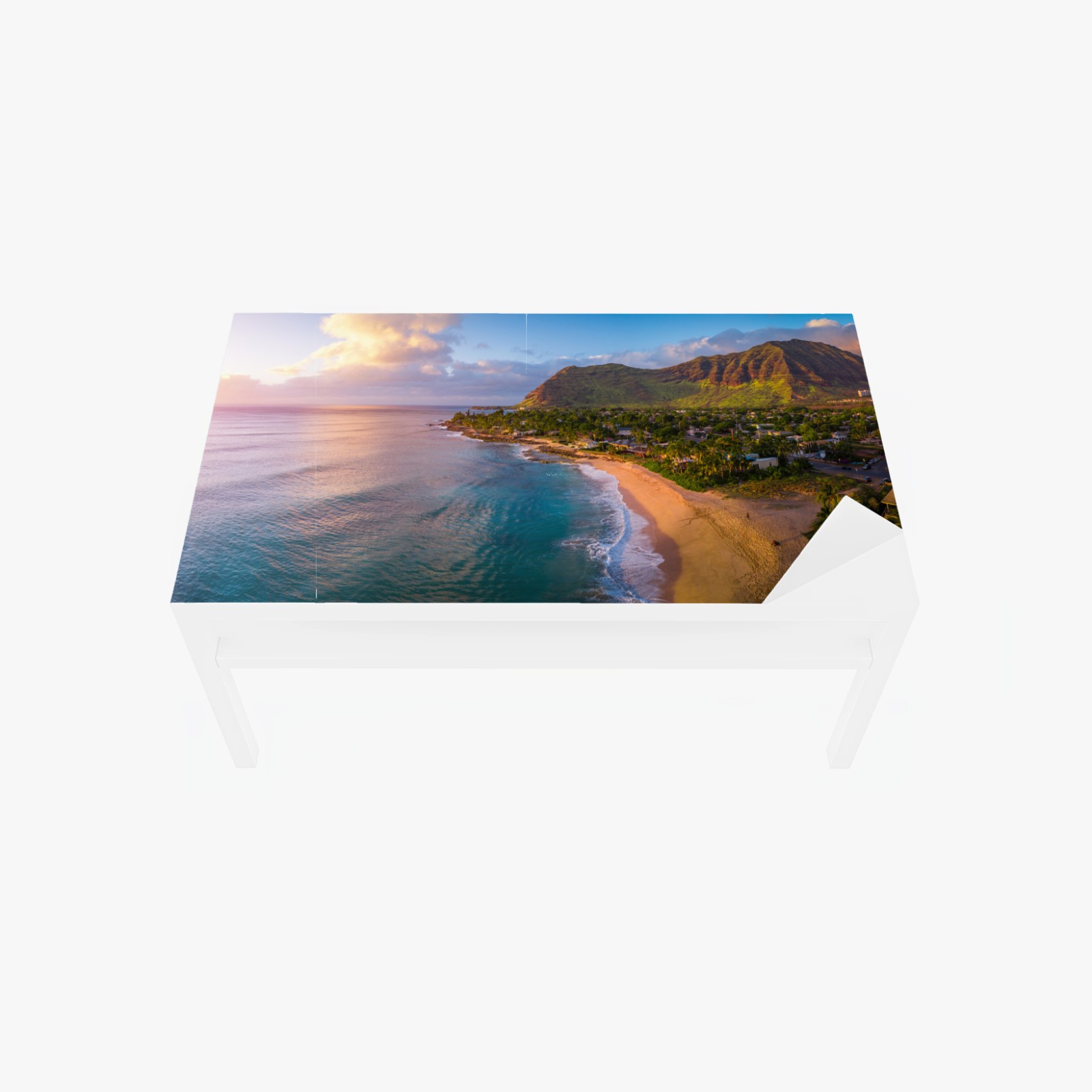 Tischaufkleber und Schreibtischaufkleber Sonnenuntergang am strand panorama mit tropischen bergen