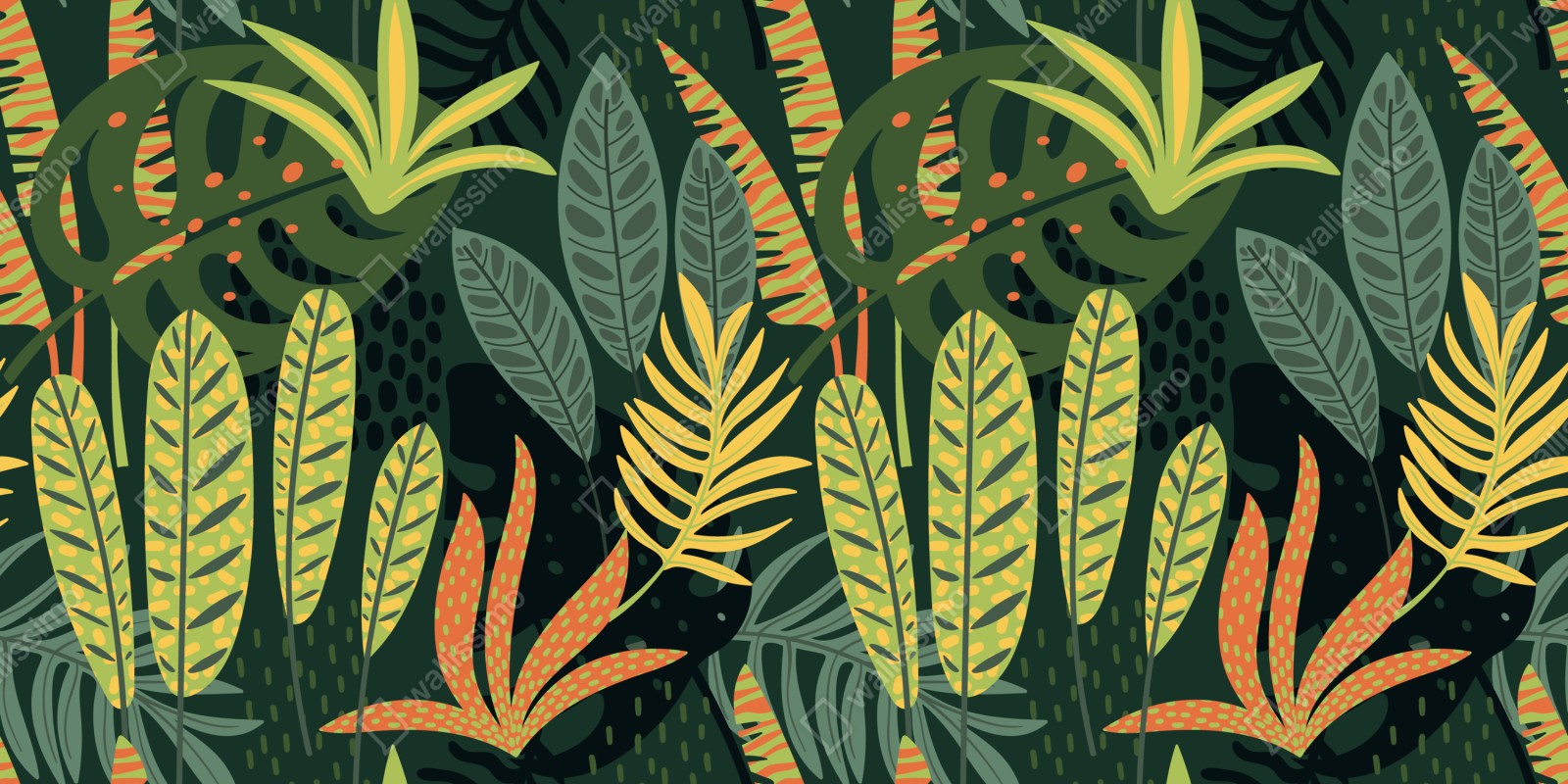 Ein lebendiges tropisches Blättermuster, das üppige botanische Atmosphäre und beruhigendes Grün in jeden Raum bringt.