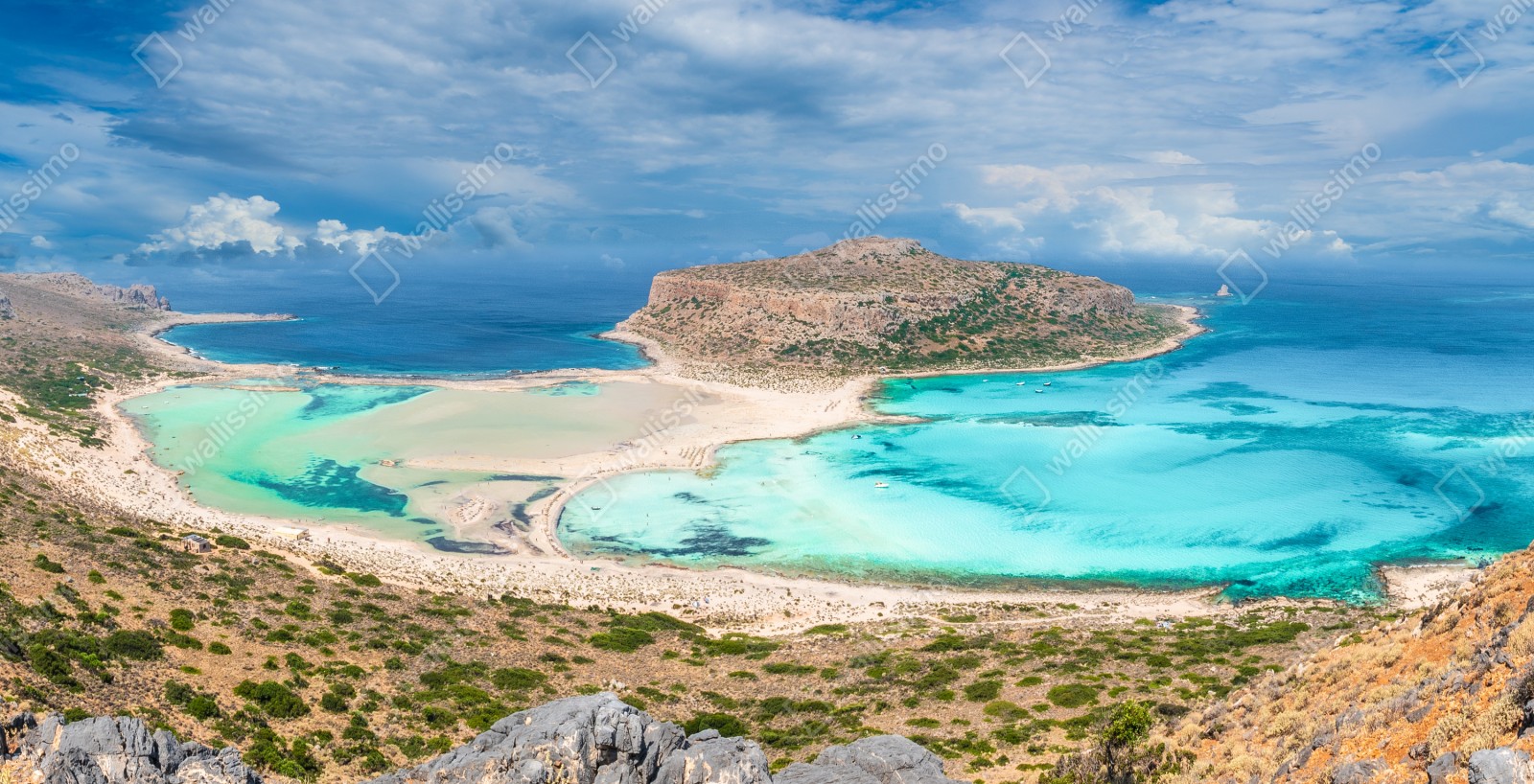 Holen Sie das sanfte Türkiswasser und die sonnigen Strände von Balos Lagoon in Ihren Raum mit diesem panoramischen Küstenmotiv, das Ruhe und Urlaubsgefühl vermittelt.
