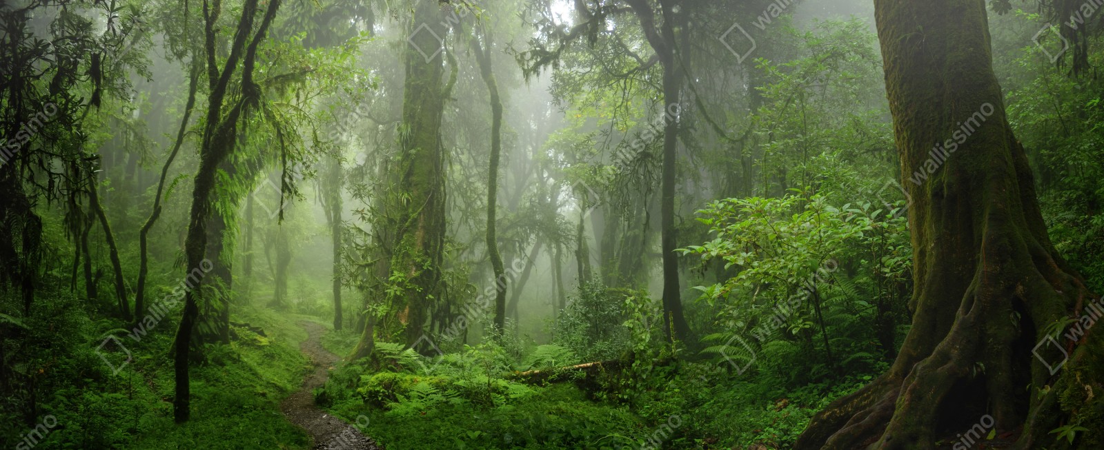 Erleben Sie die ruhige Atmosphäre eines nebligen tropischen Dschungels mit üppigem Grün und einem gewundenen Waldpfad, perfekt um Natur ins Zuhause zu holen.